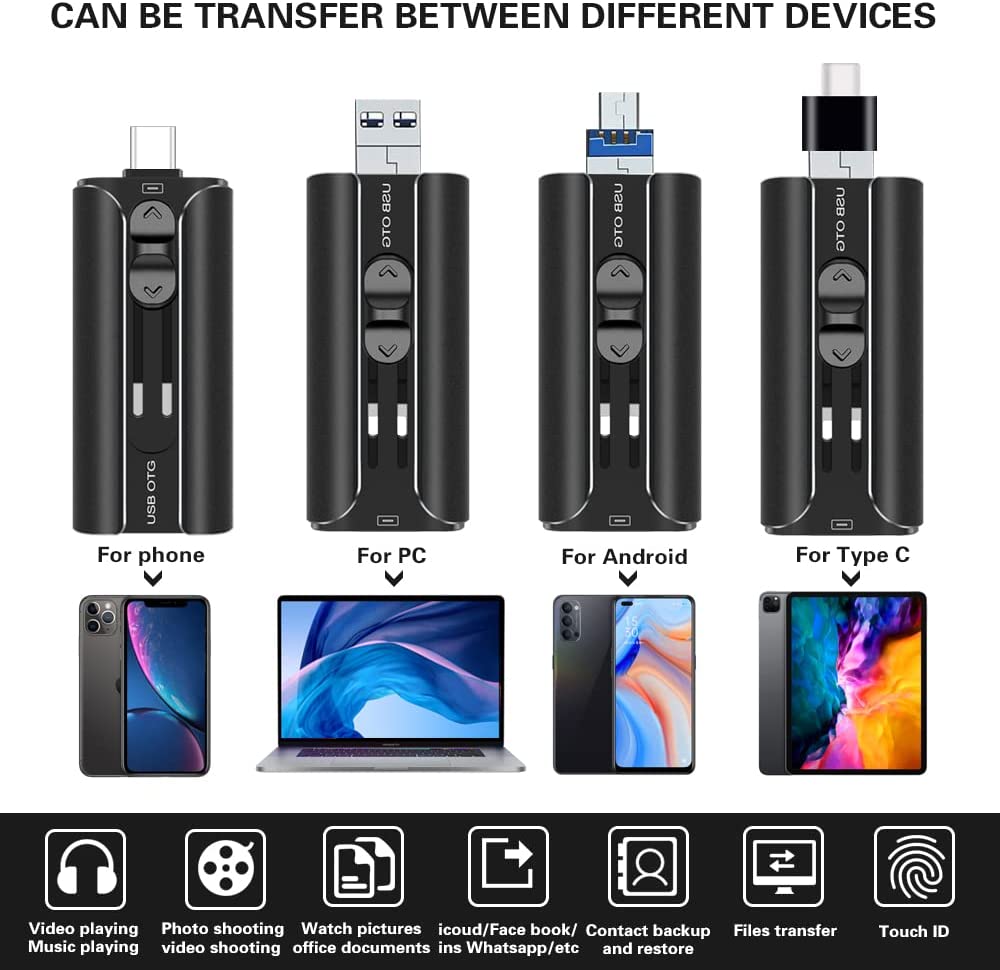 5. One-Click Backup: You can easily backup with one click and manage files at any time. No need of iTunes, manage files, phone address book, pictures and videos through the mobile app to quickly backup to TRYVAT 4 in 1 flash drive, save the storage space of the mobile phone, and at the same time, operations such as forwarding files on the flash drive can be performed.