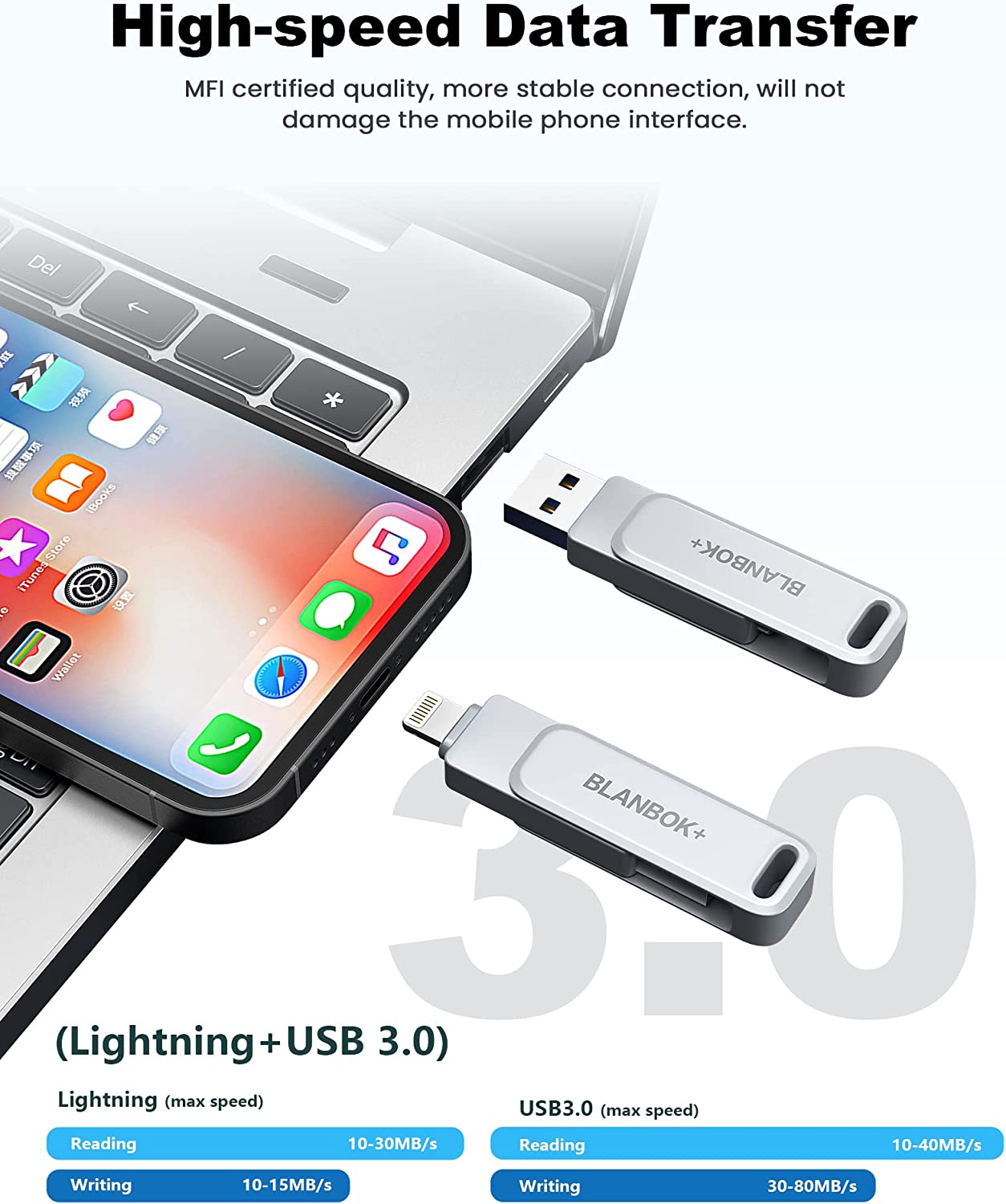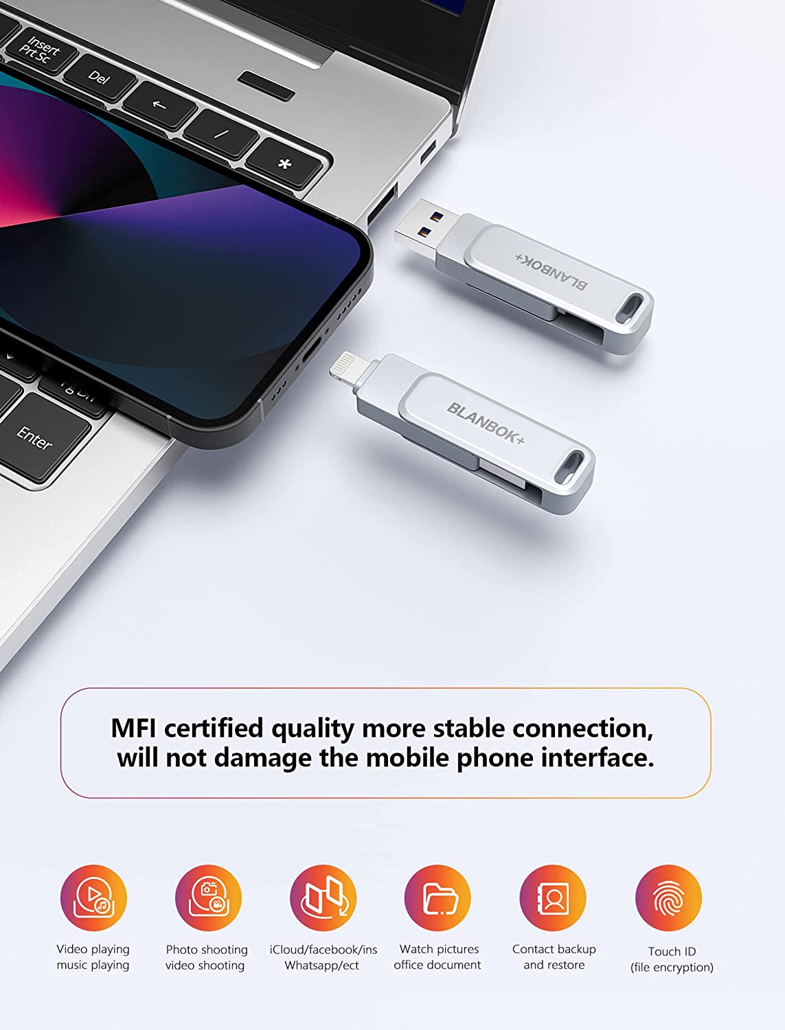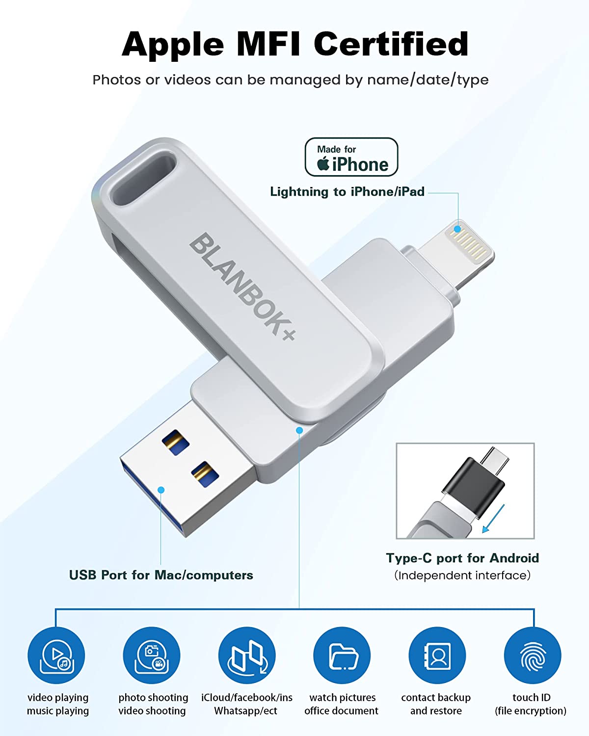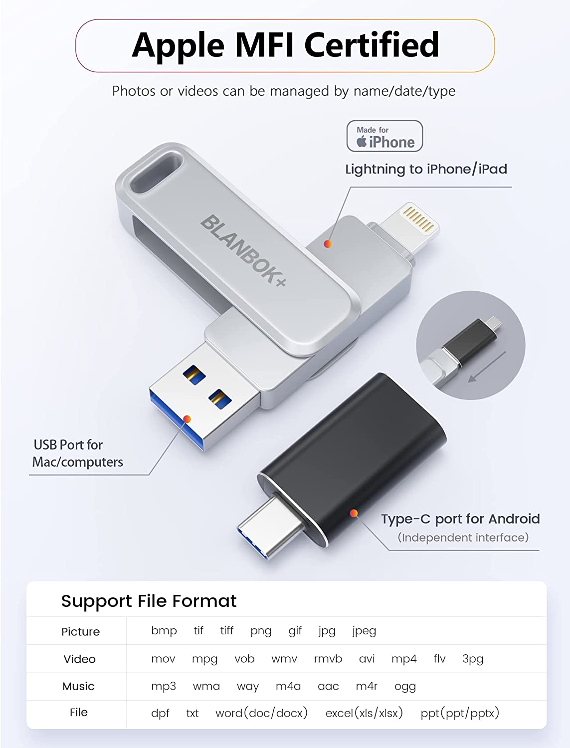 • One-click backup: Plug and play. With this MFI-certified iPhone usb flash drive, you can easily back up photos, videos, and contacts on your phone by One-Click from the APP, and you can also use the USB side to store your own backups on your computer for double insurance.(Tip: iPhone/iPad needs to download "BLANBOK+" APP from APP Store when using jump drive; Android phone needs to turn on OTG function, no need to download APP)