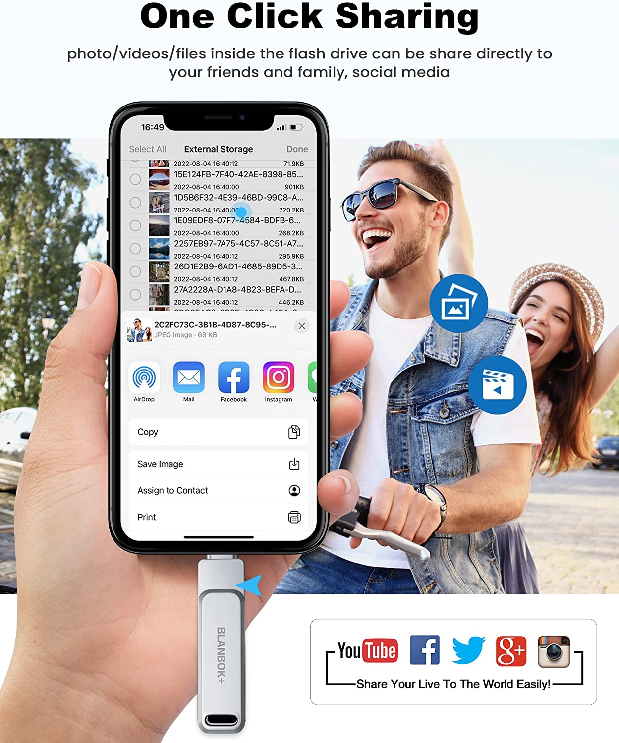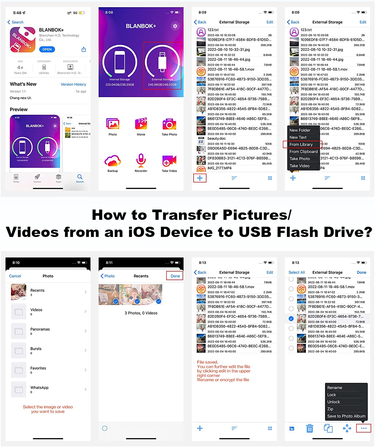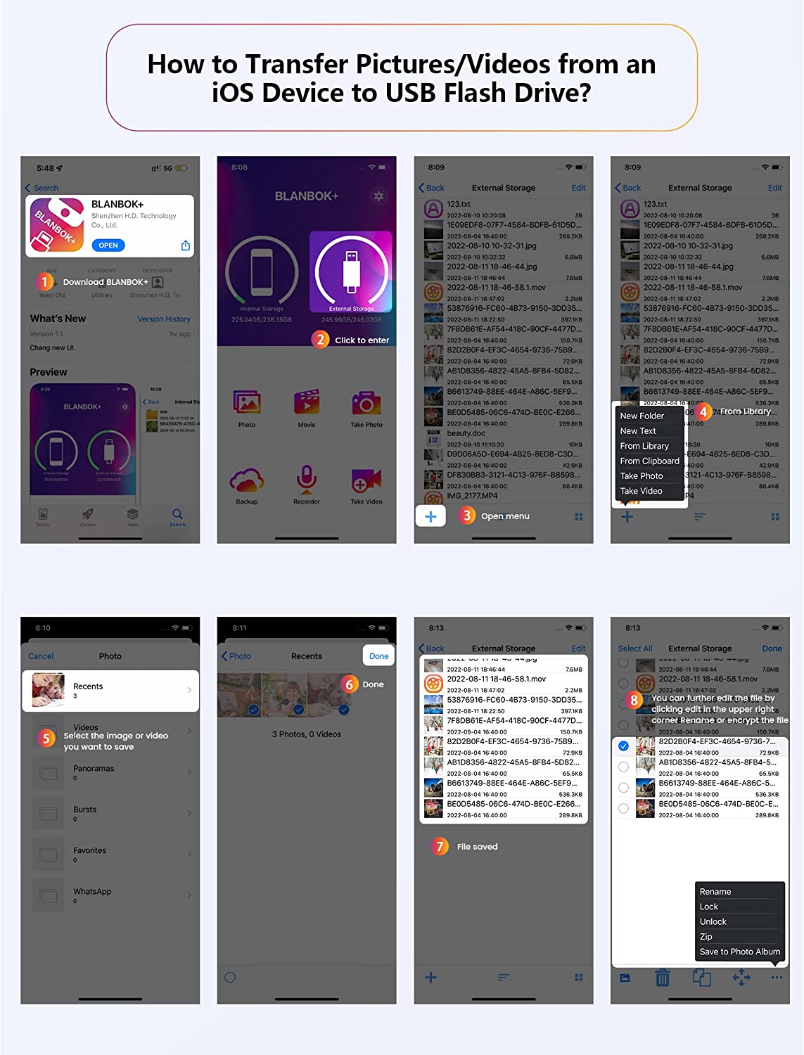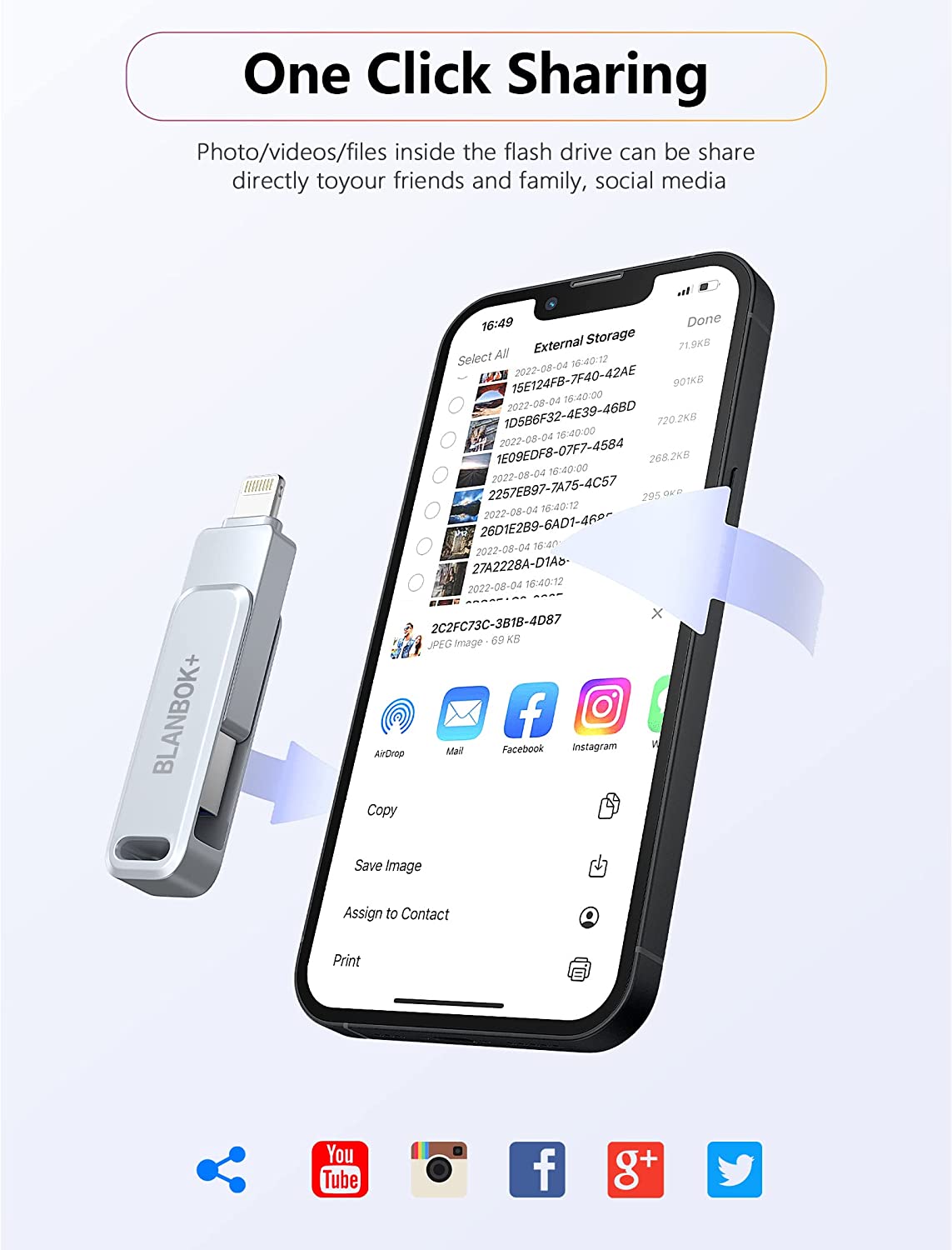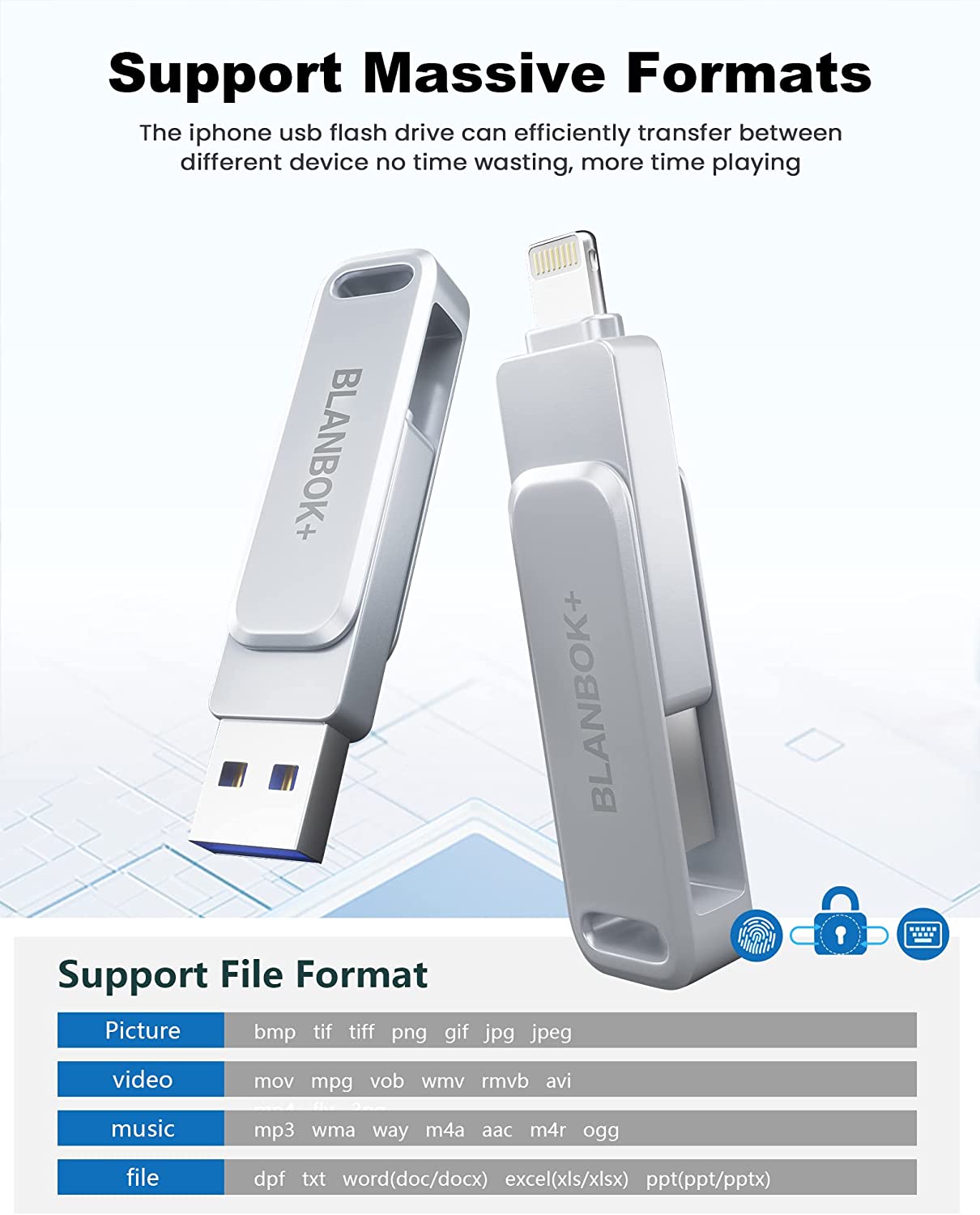 • One-click backup: Plug and play. With this MFI-certified iPhone usb flash drive, you can easily back up photos, videos, and contacts on your phone by One-Click from the APP, and you can also use the USB side to store your own backups on your computer for double insurance.(Tip: iPhone/iPad needs to download "BLANBOK+" APP from APP Store when using jump drive; Android phone needs to turn on OTG function, no need to download APP)