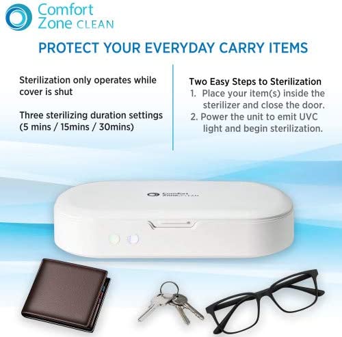 • TWO-STEP SANITIZING: Quick and easy steps to begin sterilizing your smartphone, keys, wallet, and many other devices! Just place your item inside the UV sterilizer box and close the lid. Power on the unit to begin emitting UVC light, and you're on your way to having a sterilized item!
