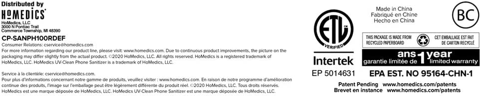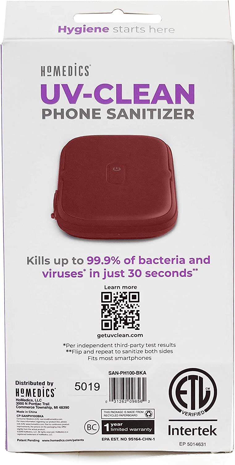 • WHAT'S IN THE BOX: (1) HoMedics UV-Clean Portable Phone Sanitizer, (1) 1-yr Warranty