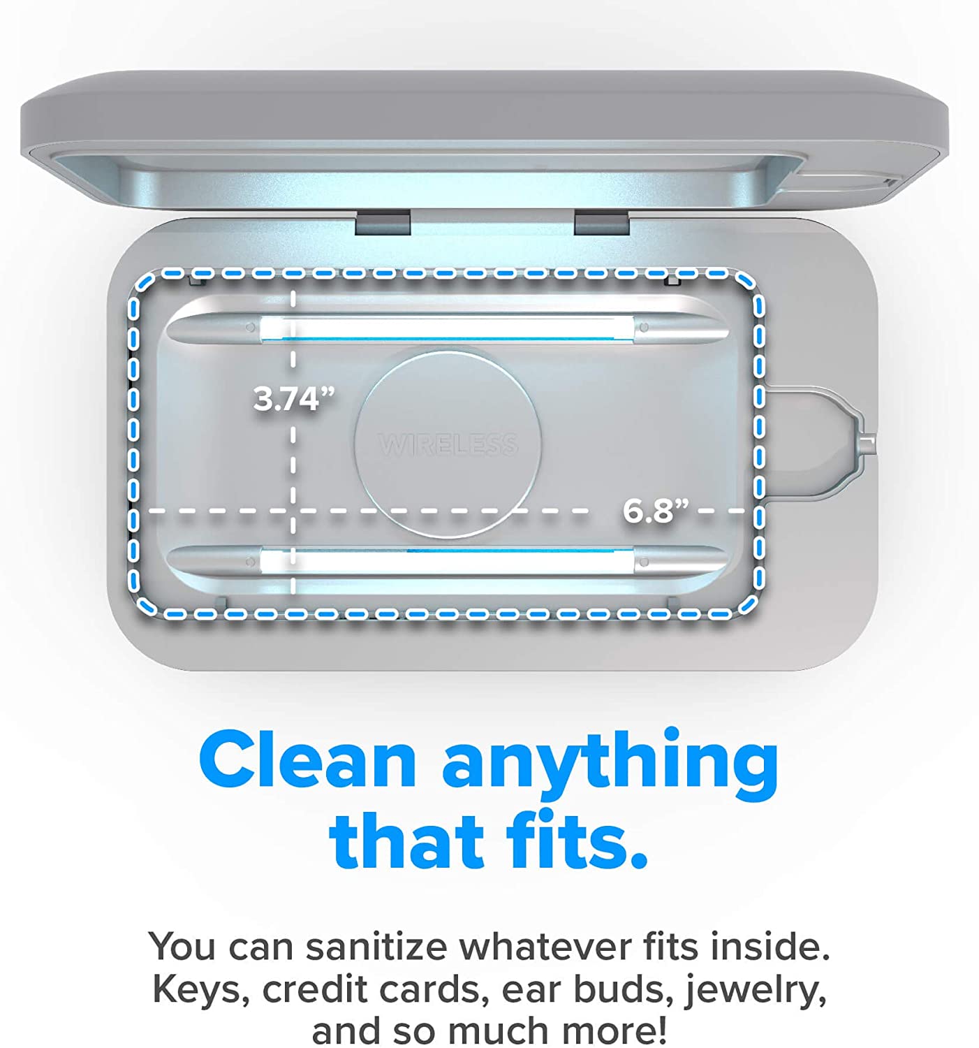 • Disinfects More than Just Phones; With the power of our orginal model, PhoneSoap Wireless disinfects anything that fits inside - pacifiers, smart watches, headphones, jewelry, wallets, keys—you name it—into this germicical box. Internal dimensions: 6.88 x 3.75 x 0.6 in.
