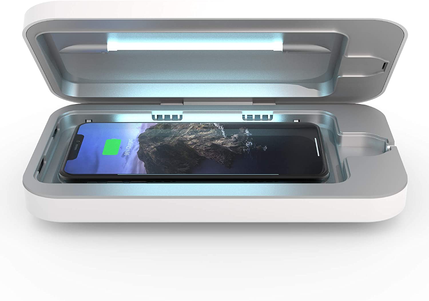 • UV-C Phone Sanitizer & Charger; PhoneSoap Wireless cleans and sanitizes the surfaces of your phone and other high touch gear. Backed by 10 years in UV technology, our best-in-class products disinfect your entire phone and small objects using UV-C light all while charging with the dual USB and USB-C charging ports.