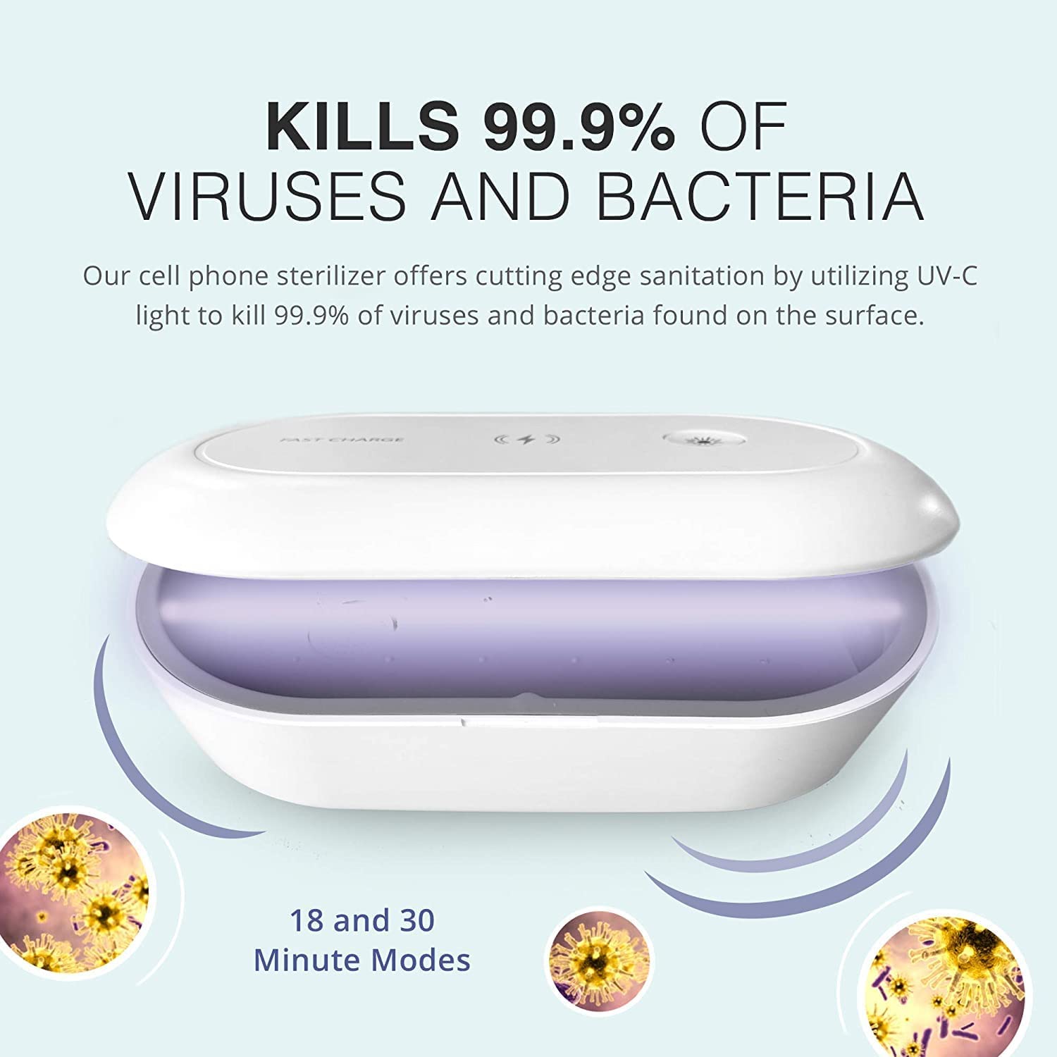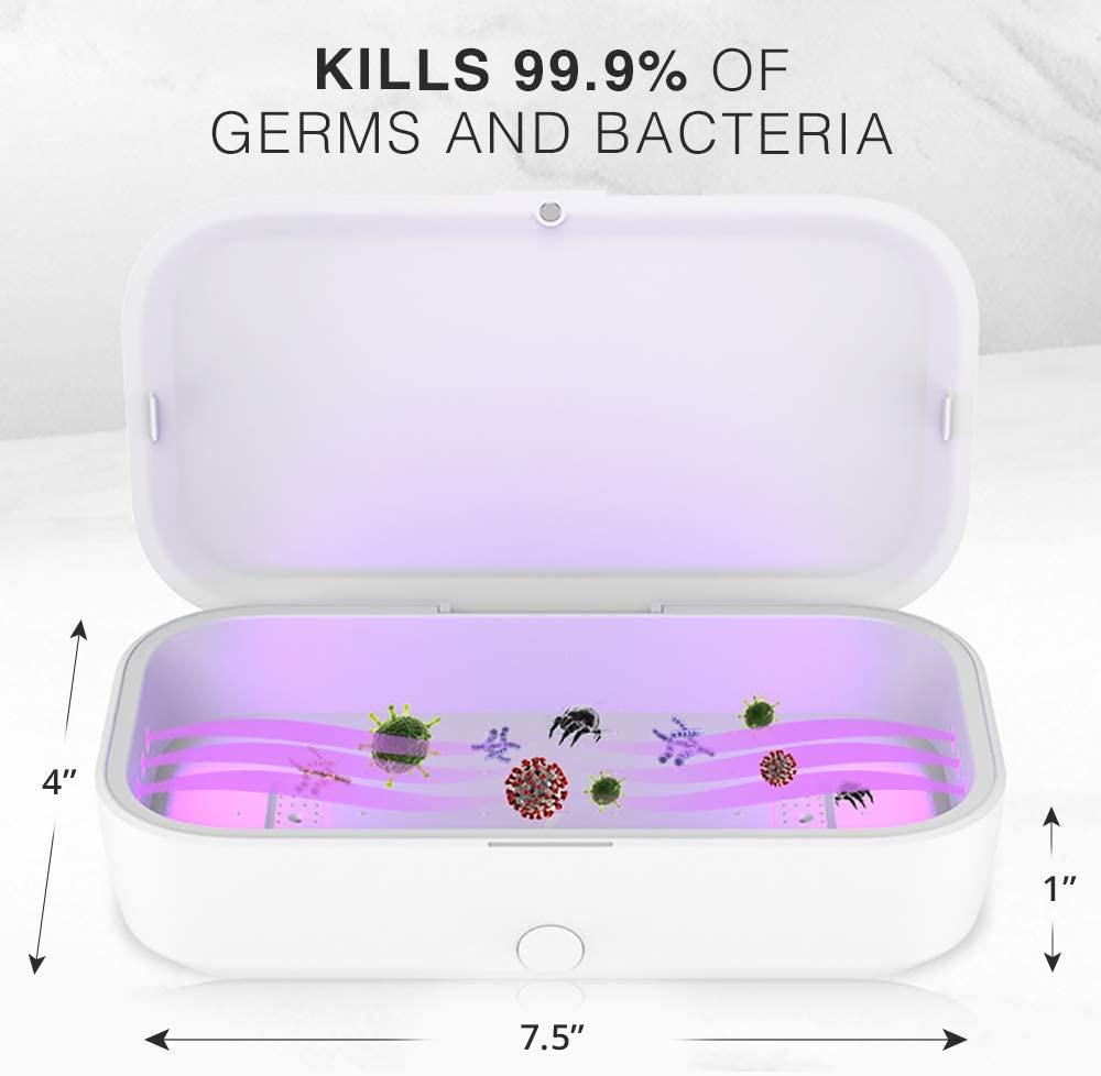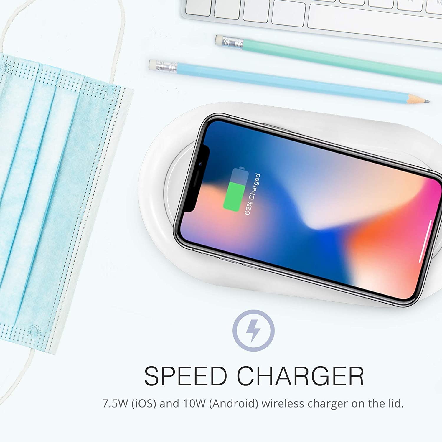 • SMARTPHONE SANITIZER AND SPEED CHARGER: Most UV light sanitizer box don’t have phone charging, or if they do its on the lid making you spend twice as long to charge AND sanitize your phone. Our UV sanitizer box solves this by offering charging directly inside the box saving you time. Our phone UV sanitizer has 7.5W (iOS) and 10W (Android) speed charging. Google to see if your phone has wireless charging capabilities.