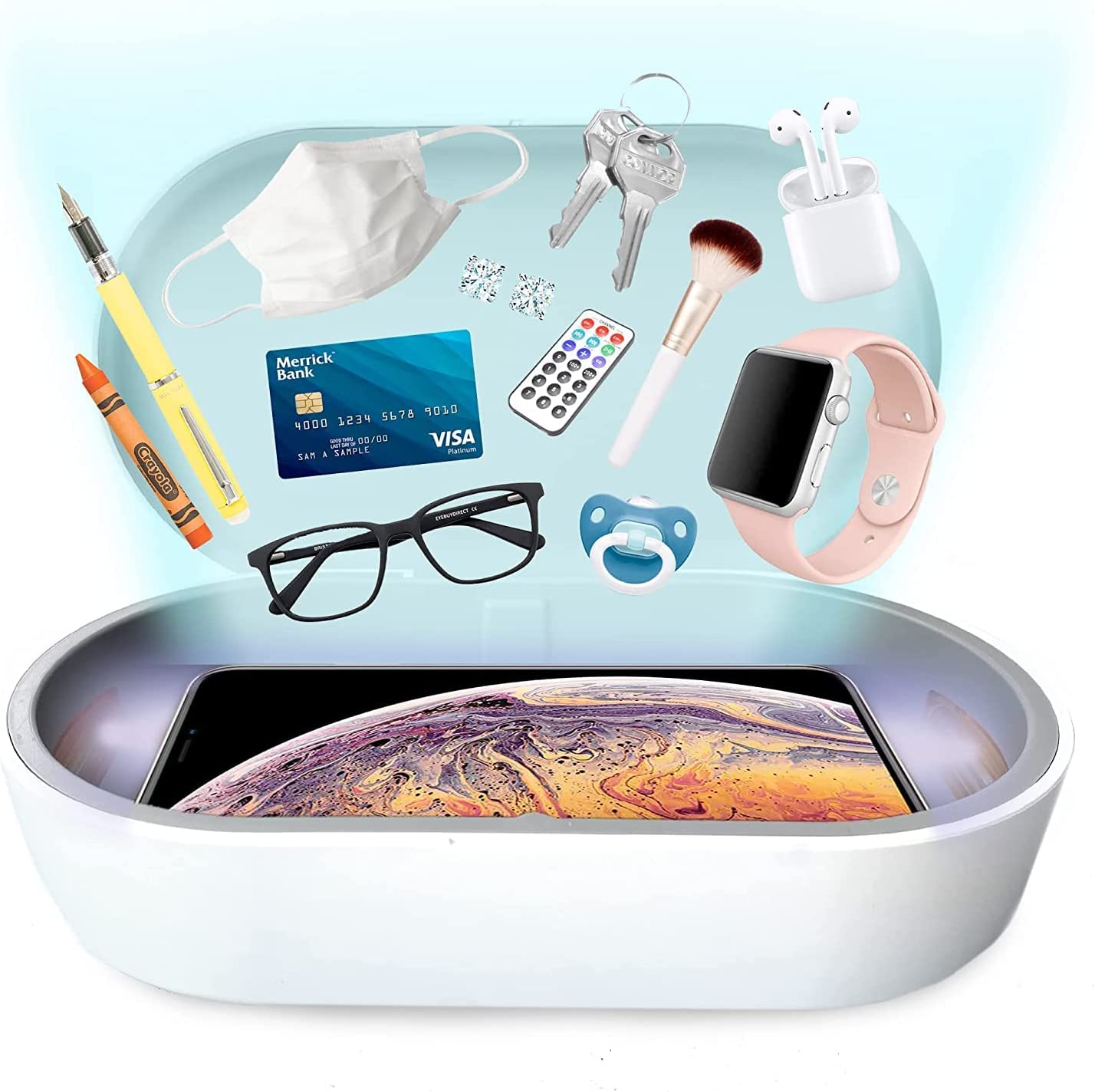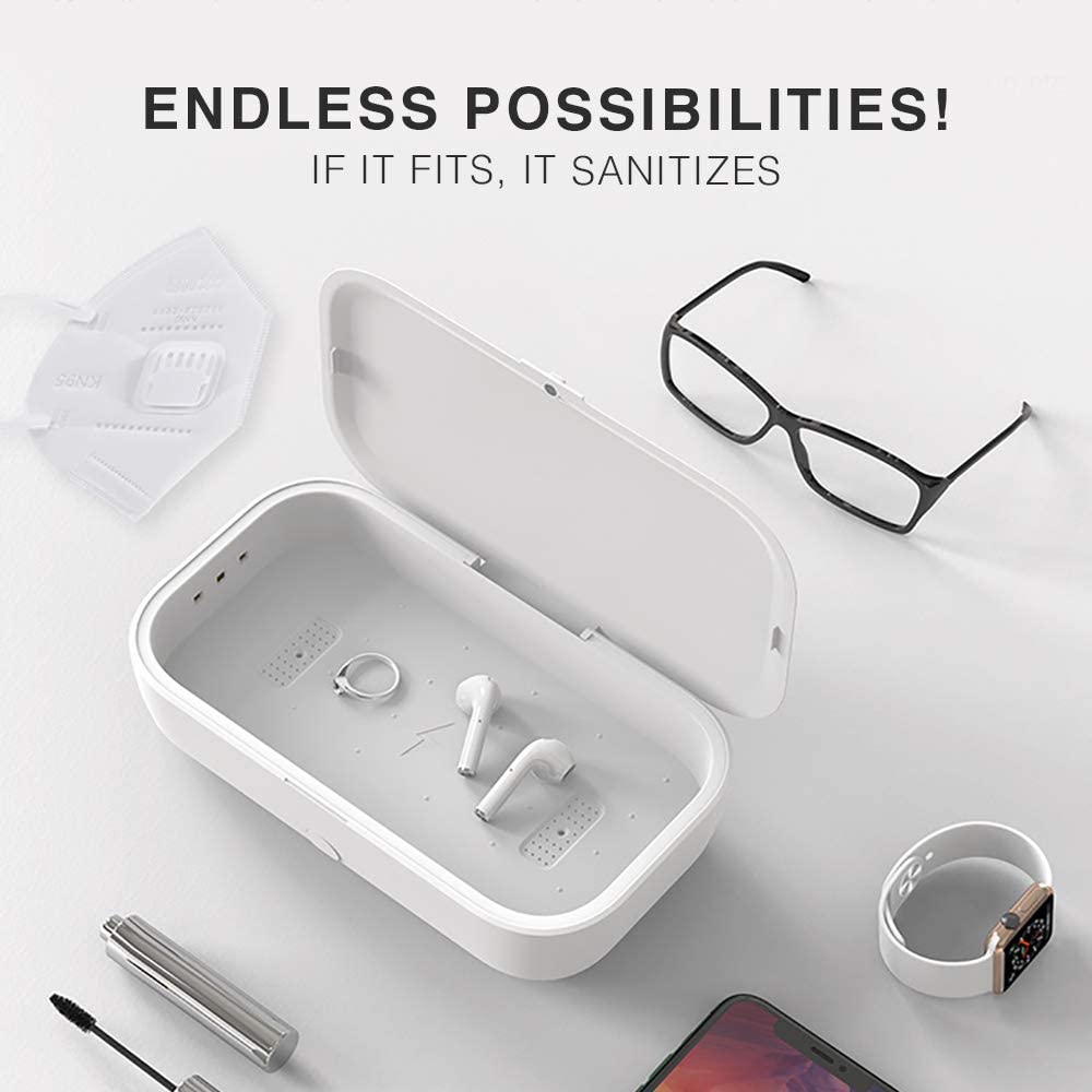 • SANITIZES MORE THAN JUST PHONES: Think pacifiers, smart watches, jewelry, glasses, keys, credit cards, makeup brushes, and essential items - you name it. If it fits inside it can be sanitized. Our UV cell phone sanitizer was designed to fit all phones up to 6.6”.