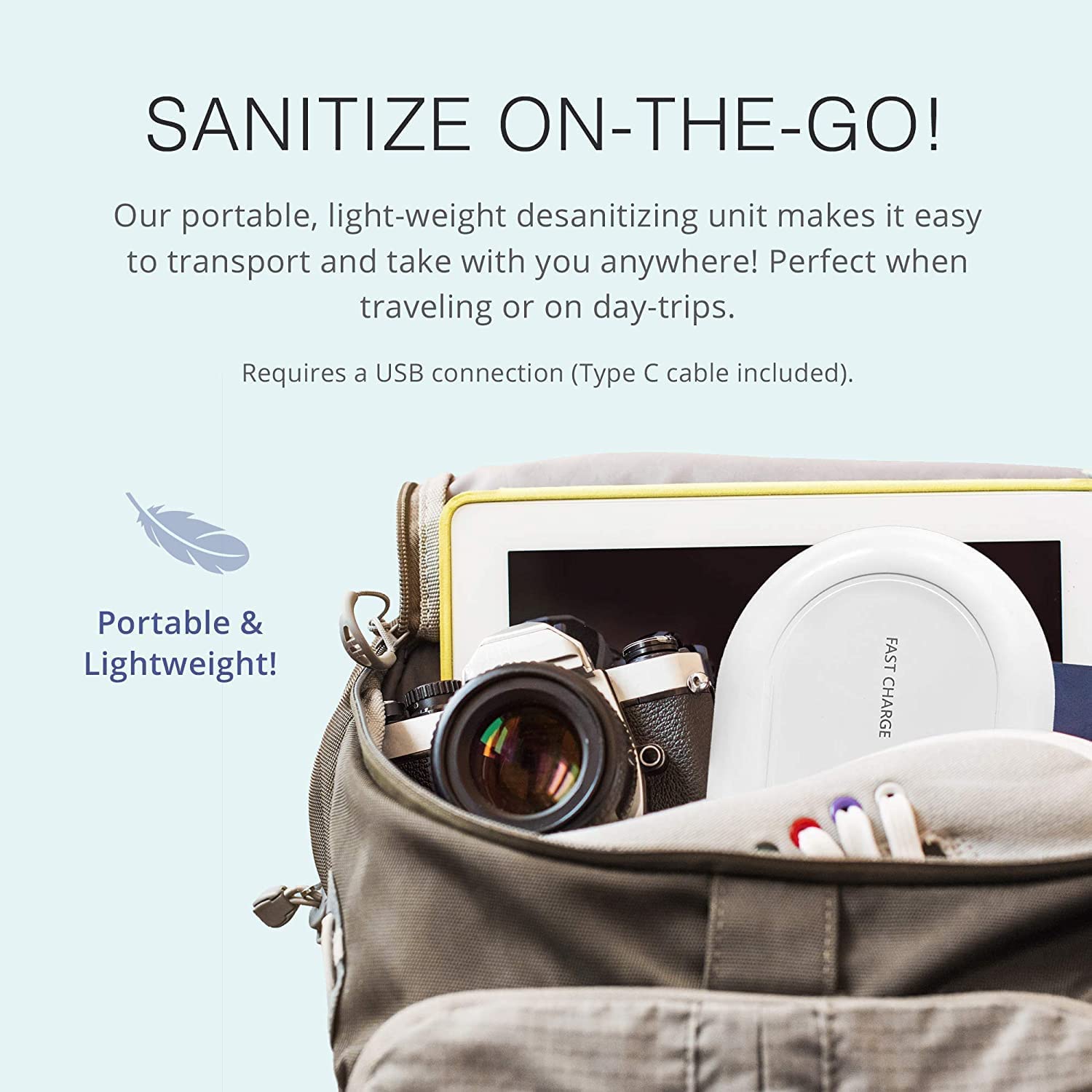 • CAR COMPATIBLE: Cars with USB ports can plug in on the way home from the grocery store or office. No need to bring ger*ms home! Large enough (8 ¼ x 5 ¾ ) to fit many things yet portable to take with you anywhere. Fits perfectly in purses, backpacks, luggage for use at home, office, car or travel use.