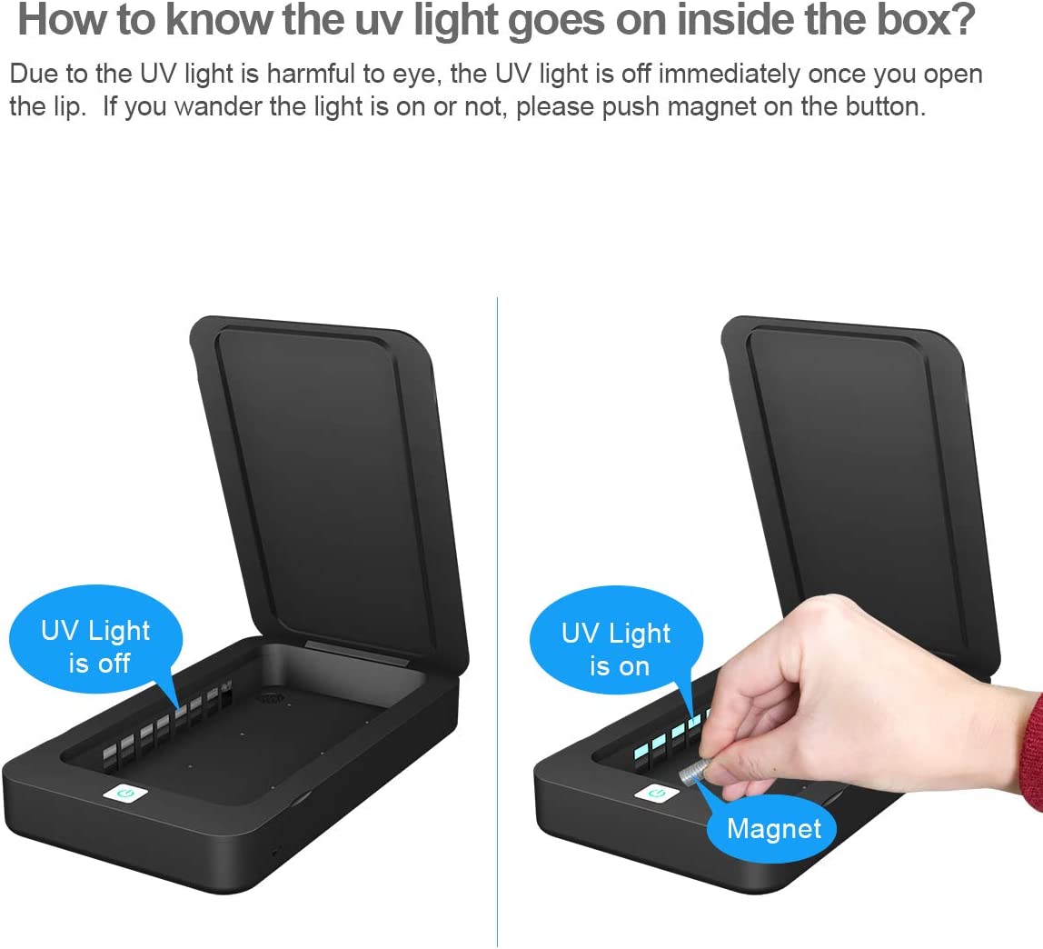 • ▶Portable Sterilizer- The sleek, ergonomic and compact design of our Phone Sanitizer makes it easy to take with you, wherever you go. Specially this phone sterilizer is powered from laptop desktop power bank usb charger, you can sanitize your cell phone with its case whether at work home traveling or car.