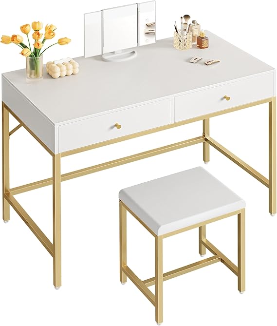 SUPERJARE Vanity Desk, Makeup Vanity with Lighted Mirror, White Desk with Drawers, 35.4 Inches Makeup Vanity Desk with Lights, for Bedroom, White and Gold