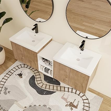 60 Inch Double Sink Wall Mounted Bathroom Vanity, 60" Floating Bathroom Vanity with White Resin Basin Sink Top, with 4 Doors and Storage Shelves