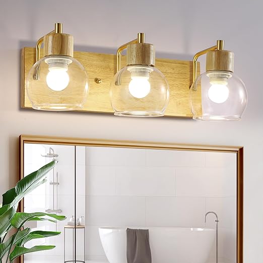 3 Light Bathroom Vanity Light Fixturesä_«Bathroom Lighting Fixture Over Mirror, Modern Farmhouse Wooden Wall Sconce, with Clear Glass Lampshadeä_«Suitable for Bedroom, Hallway, and Living Room