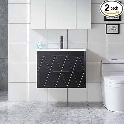 eclife 24" Bathroom Vanities Cabinet with Sink Combo, Wall Mounted Floating Cabinet W/Decor Line, Soft-Close System, 2 Extra Big Drawers, Matte Black Faucet, Black
