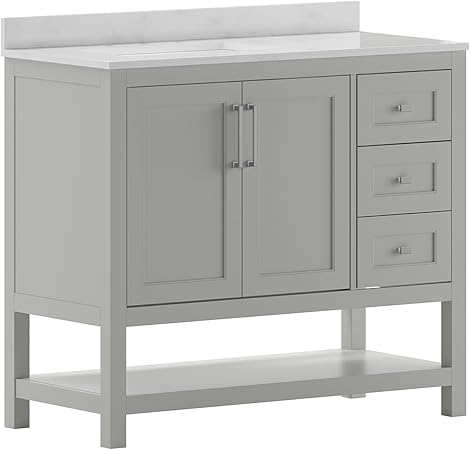 Flash Furniture Vega 42 Inch Bathroom Vanity with Sink, Storage Cabinet with Soft Close Doors, Open Shelf and 3 Drawers, Carrara Marble Finish Countertop, Gray/White