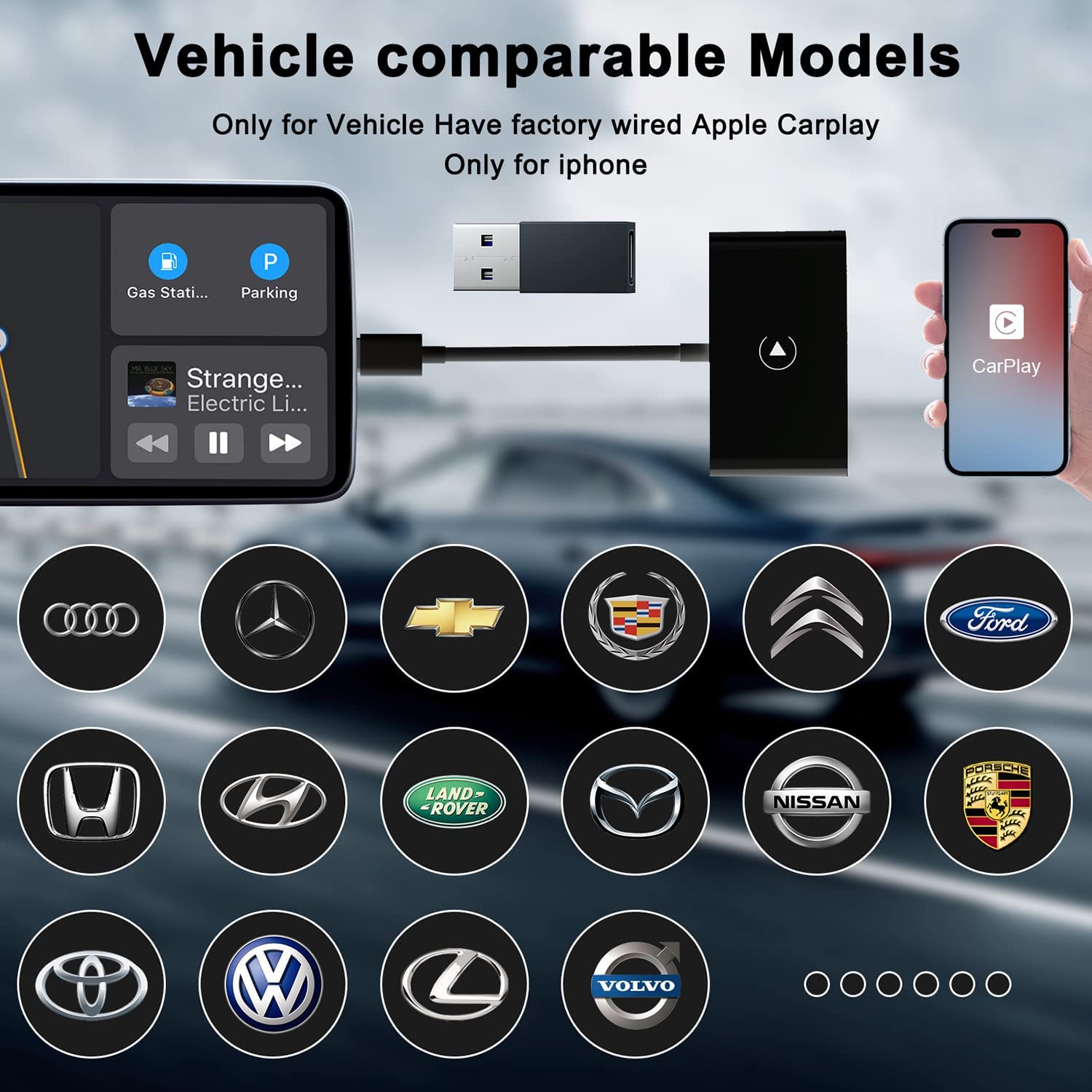• ✔️Even Wider Compatibility:The Wireless CarPlay dongle compatible with more than 600 car models. Compatible with: Ford Chevrolet Toyota Subaru Jeep Honda Nissan Cadillac RAM mercedes Peugeot Lincoln Volkswagen Volvo Mazda Porsche Benz etc. *Your car must have a factory wired CarPlay system in order to work with this adapter.