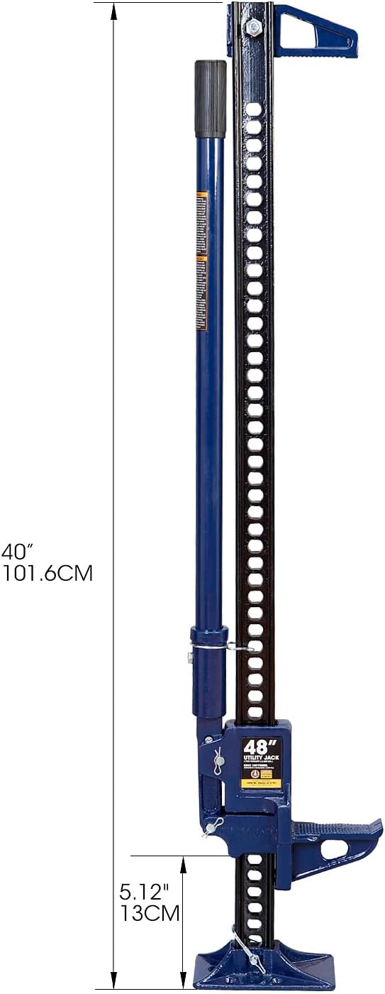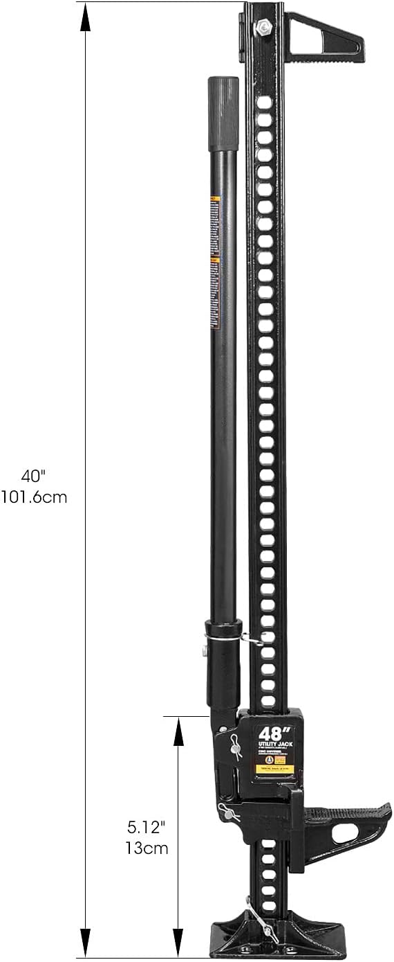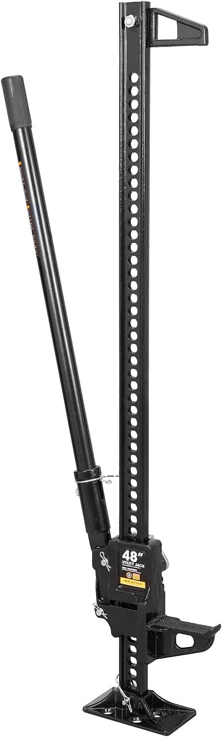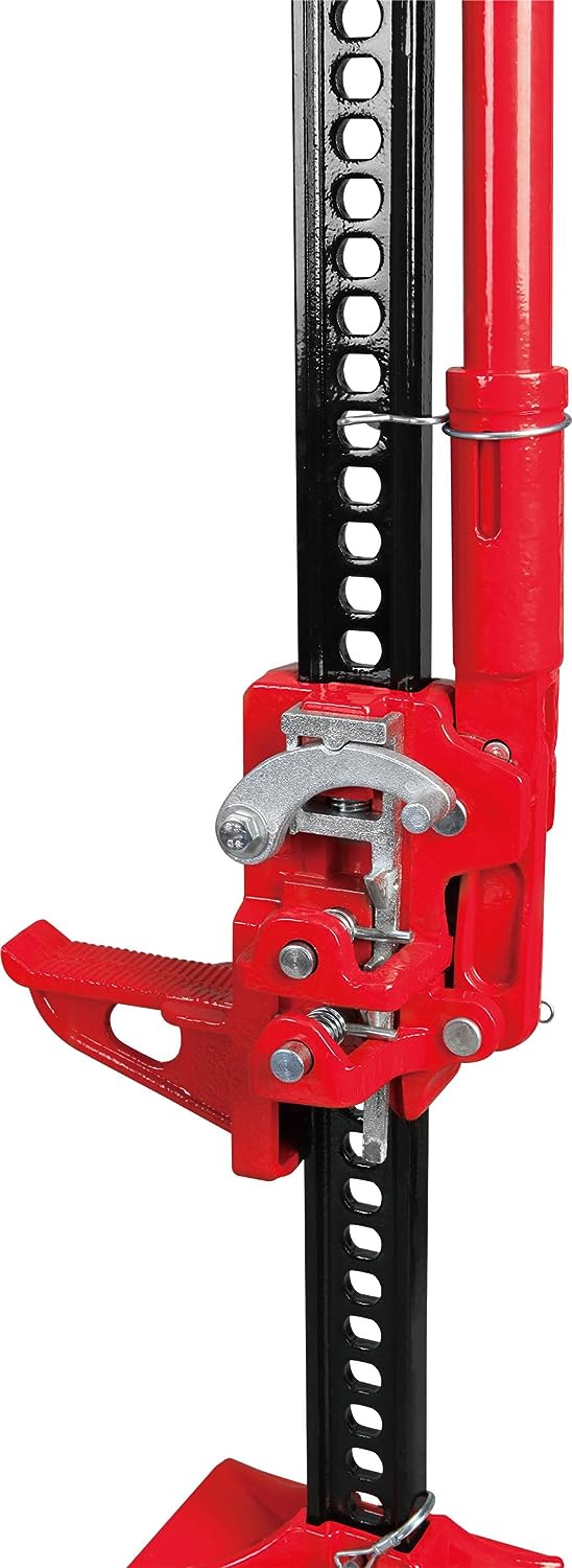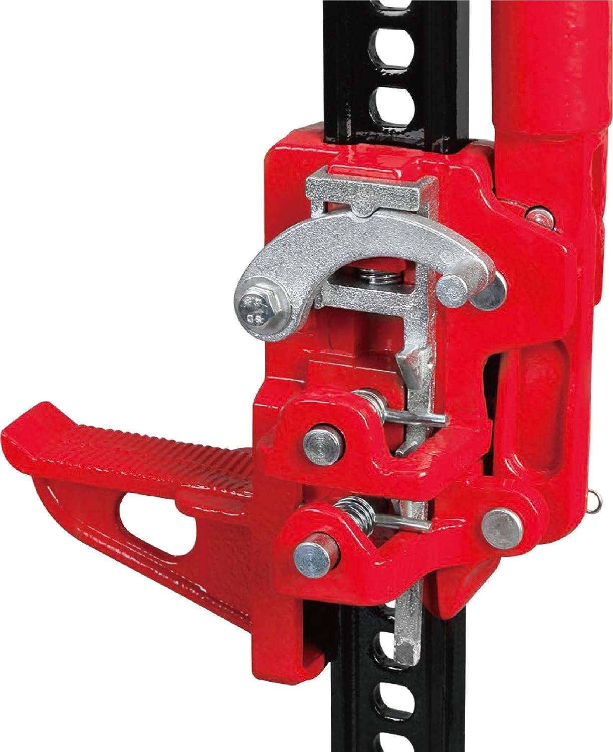 The Torin BIG RED TR6501B ratcheting off-road/utility farm jack is ideal for any application that deals with lifting, pulling, clamping, winching, and spreading. This 48" jack has a lifting range of 5.12" to 40" and a 3 ton (6,000 lb) load capacity. Multi-directional jack is lightweight and designed to be used vertically and horizontally. The rubberized grip on the handle provides comfort and a better hold. An adjustable top clamp clevis can be moved to any position for clamping purposes. Great for off-road and rough environments, farm-related applications, and as an emergency fire and rescue tool. The fast lifting mechanism ensures lifting speed and safety. A thick, wide base delivers added stability. The Torin ratcheting off-road/utility farm jack has a rust-resistant, powder coated finish with zinc-plated hardware. Includes a limited 1 year manufacturer warranty.