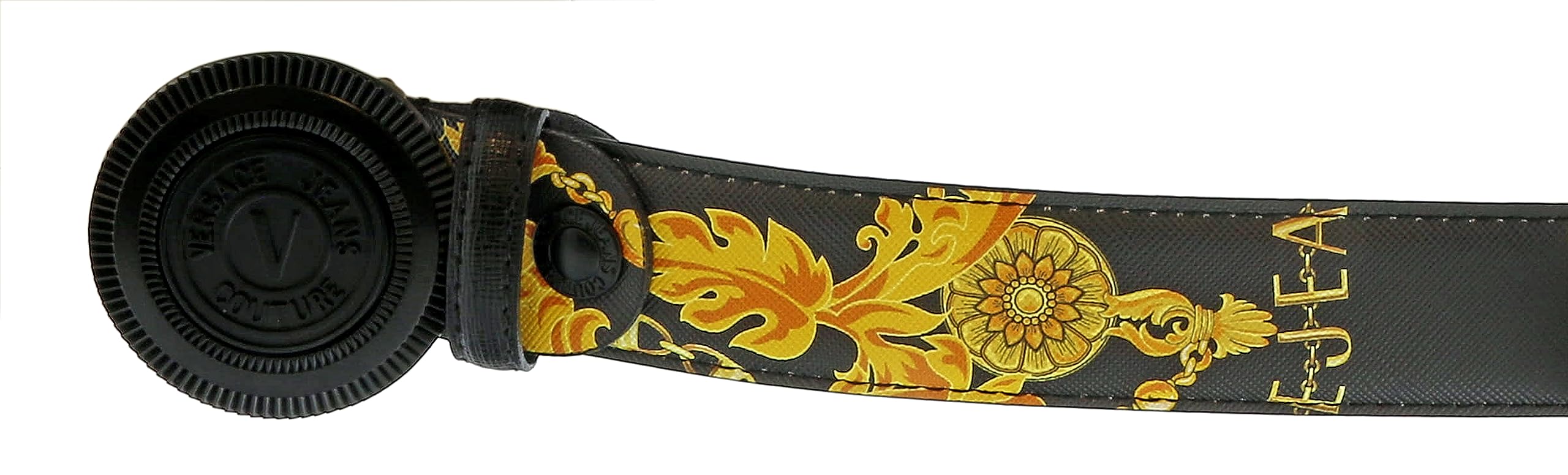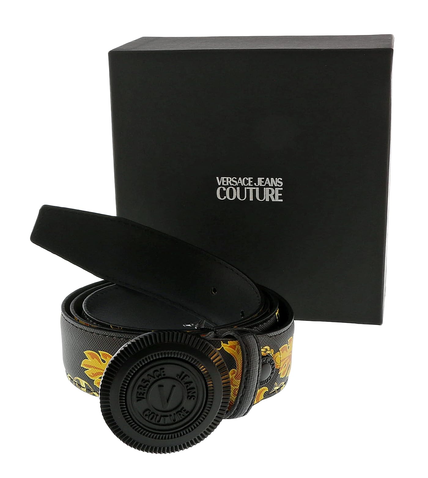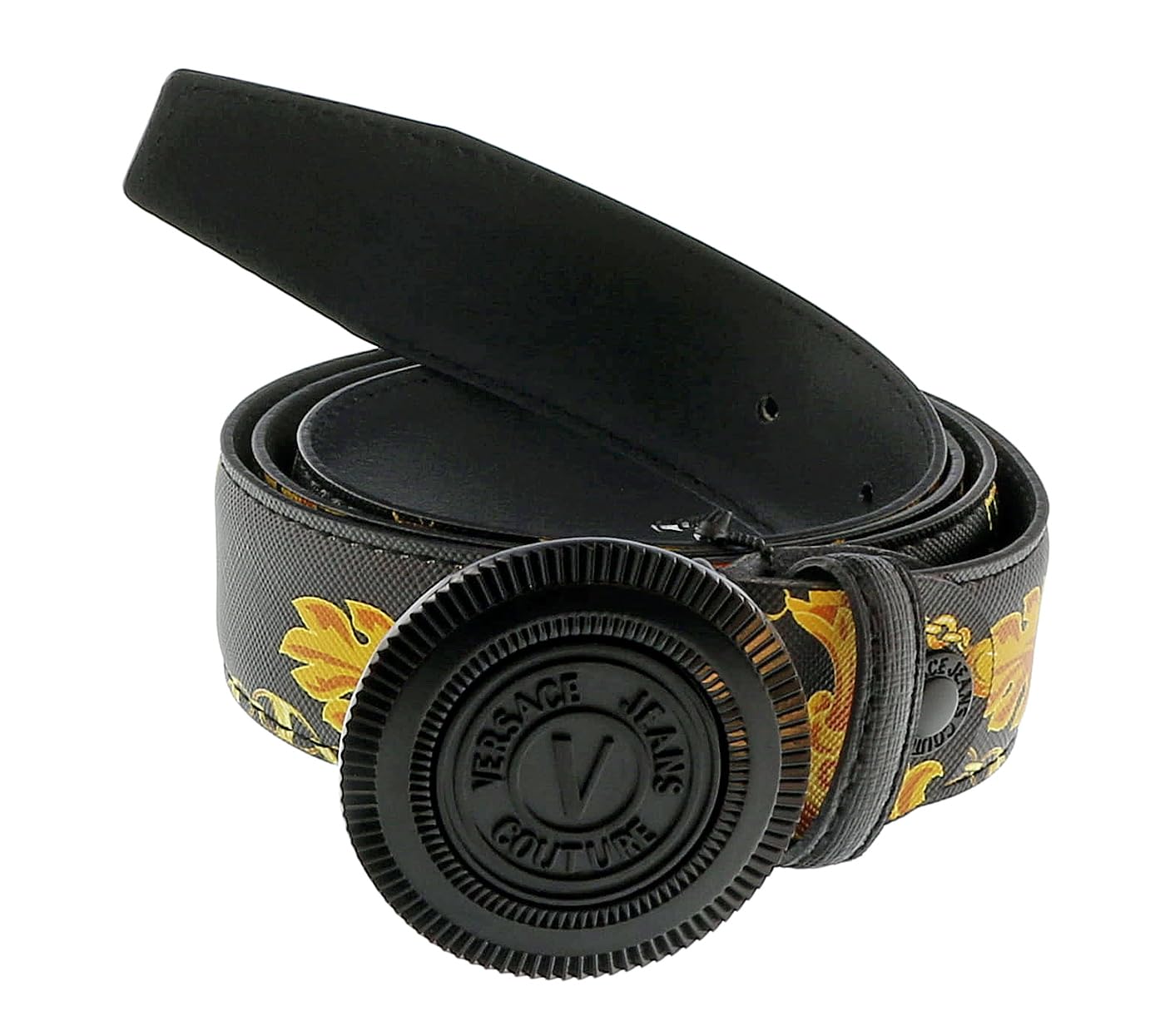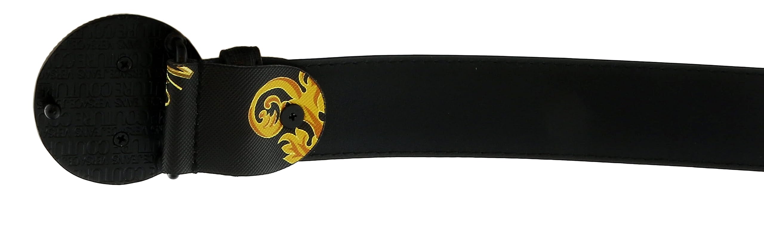 Details: Elevating a polished design with a signature buckle, this Versace Jeans Couture belt makes a sophisticated addition to any gent's accessories edit. Crafted in Italy from mixed materials, the belt refined piece pairs effortlessly with suiting and denim alike.