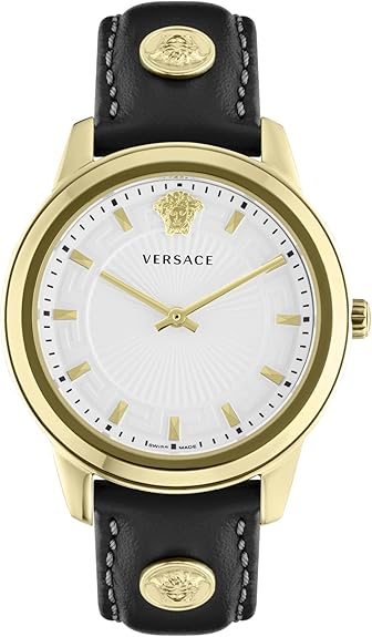 Versace Greca Collection Luxury Womens Watch Timepiece with a Black Strap Featuring a Gold Case and White Dial