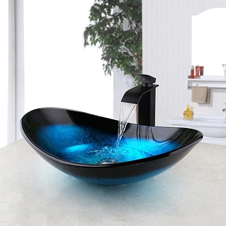 Bathroom Vessel Sink, Black&Blue Vessel Sink, Oval Glass Vessel Sink with Waterfall Faucet and Pop-Up Drain, Boat Shape Bathroom Sink Above Counter, Artistic Tempered Glass Vessel Sink