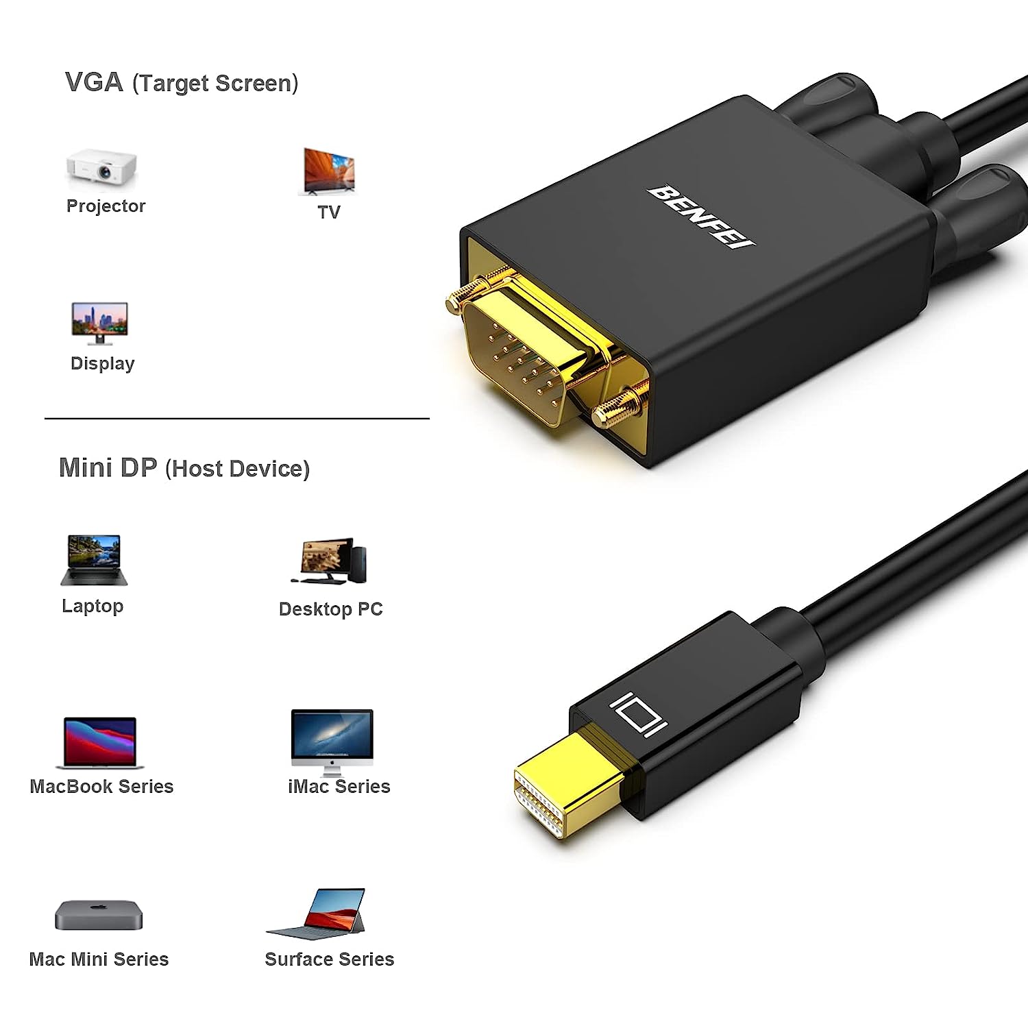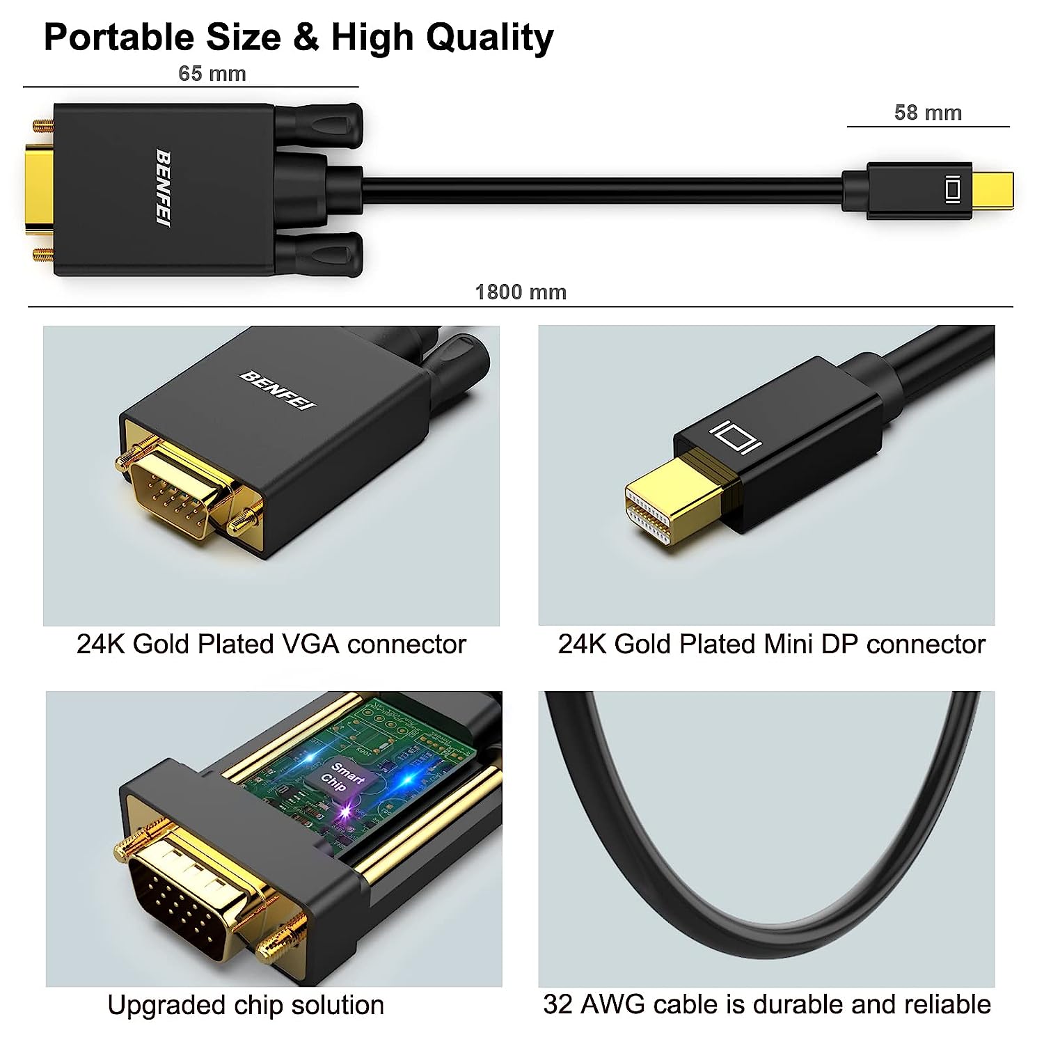 • EXCELLENT TRANSMISSION: Benfei Mini DisplayPort to VGA 6 Feet Cable utilizes better chip solution and professional multiple shielding for instaneous and accurate data streaming. [NOT Thunderbolt 3 Compatible]