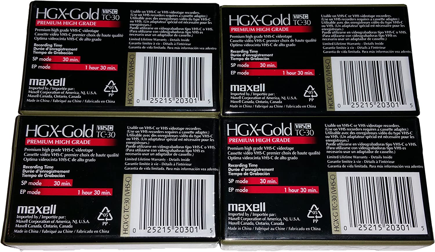 Four (4) pack of Maxell VHS-C TC-30 HGX-Gold Blank Videocassettes. Each cassette works in VHS-C camcorders and can be played in VCR's using an adapter.