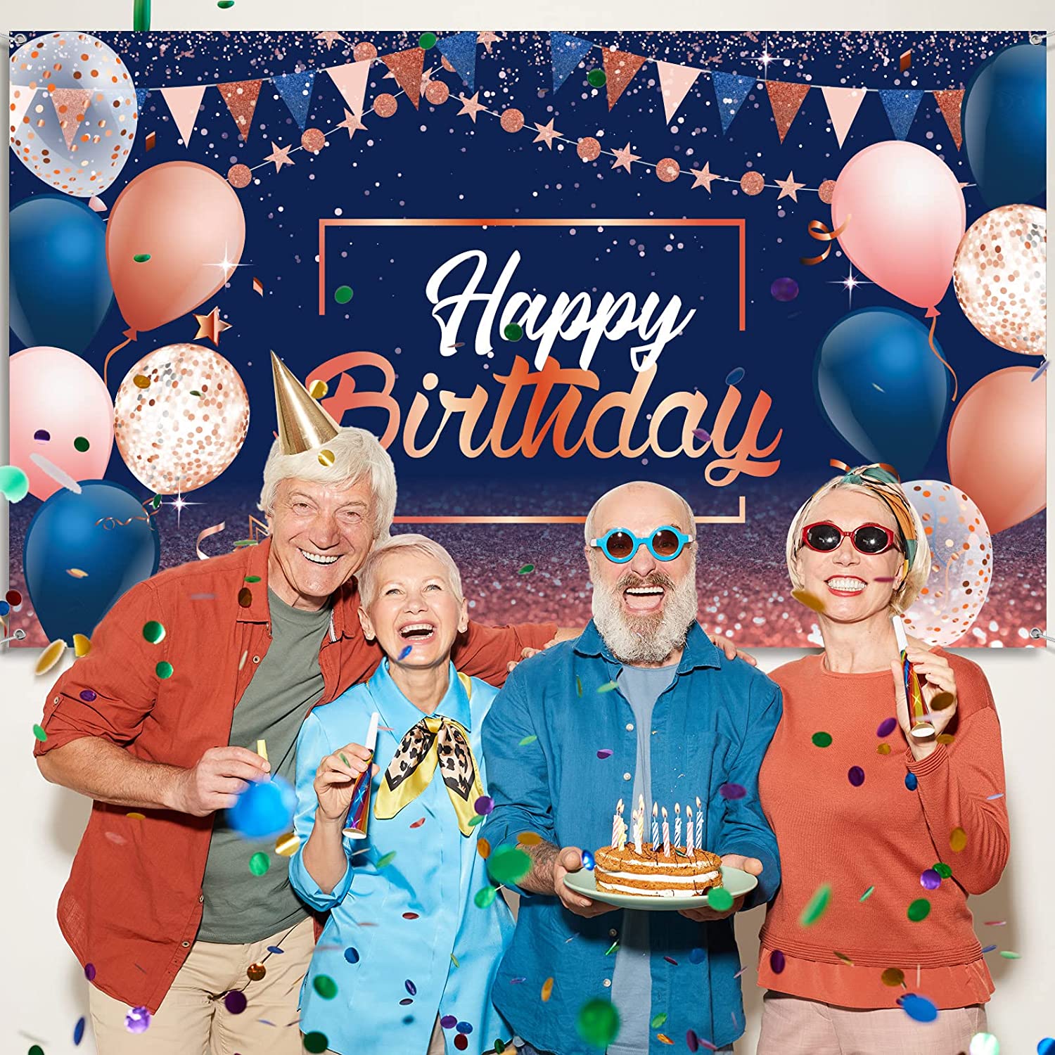 Happy Birthday Decorations Backdrop, Glitter Birthday Backdrop Sign, Happy Birthday Banner, Birthday Party Supplies Photo Background for Children Men Women, 72.8 x 43.3 Inch (Silver and Navy Blue)