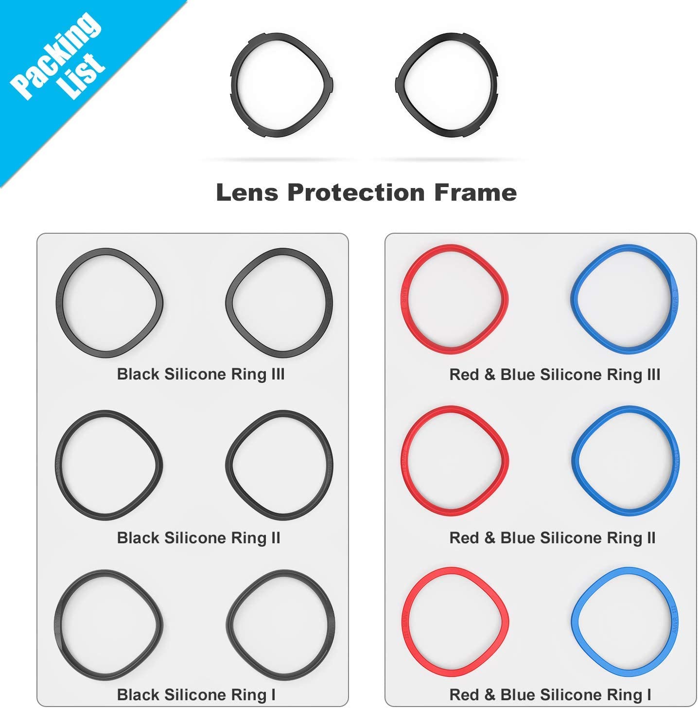 • 【Set Composition】The Set has Two pieces Lens Protection Frame and 12 pieces Silicone Rings. The 12 silicone rings are divided into three specifications, namely high, medium and low. The high ones are 7mm thick, the middle ones are 5mm thick, and the low ones are 4mm thick. Consumers can choose the gasket that suits them according to their comfort level.