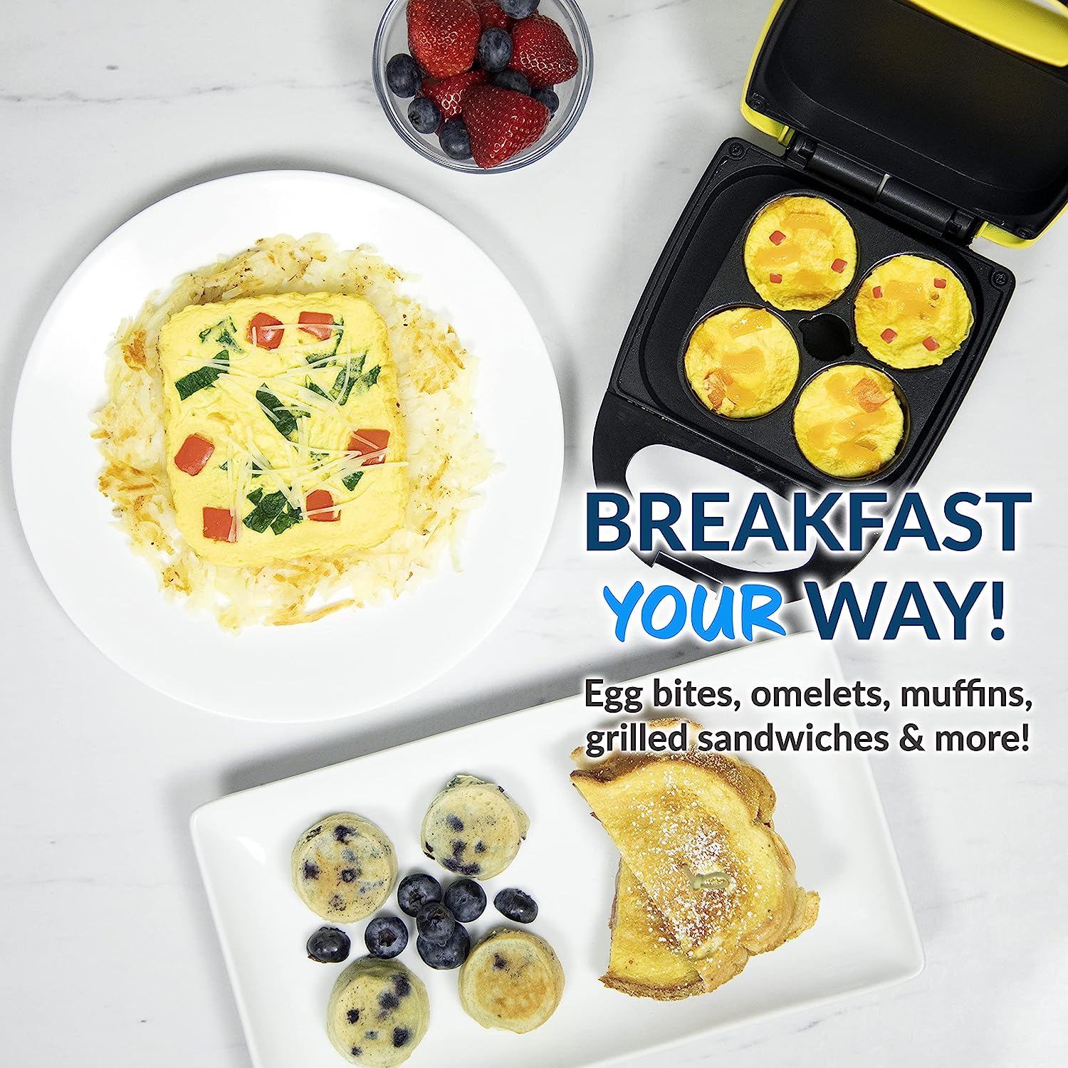Hectic mornings? Not anymore! Quickly make delicious, healthy egg dishes with the MyMini Personal Breakfast Bites Maker! Cooking is as simple as 1-2-3 - all you have to do is plug in the unit, wait a couple of minutes for it to preheat and then you can start cooking! It's compact and lightweight so it won't create clutter in your kitchen - making it perfect for small kitchens, apartments, dorms and campers/RVs. In addition, this is the perfect gift for any occasion!