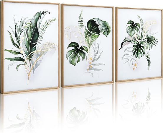 ArtbyHannah Framed Canvas Wall Art for Living Room Botanical Wall Art Gold Modern Wall Decor with Green Plant Pictures for Bedroom Bathroom (12x16 Inch 3pack Beige Framed)