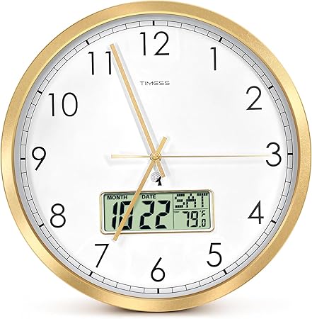 Atomic Analog Wall Clock, WWVB Self-Setting Battery Operated 14" Large Dial Non-Ticking Silent Easy to Read & Use Clock with LCD Display, Ideal Modern Home, Kitchen, Office D�©cor (Gold)