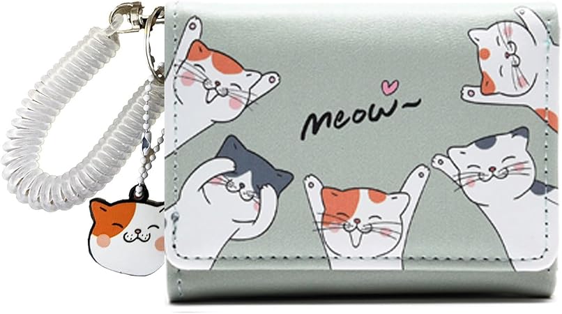 Small Womens Wallet, Cute Cat Tri-Folded Girls Wallet Slim Kawaii Wallet for Teens, Fashion Small Wrist Wallet with Cash Pocket Card Holder ID Window (Cat Green)
