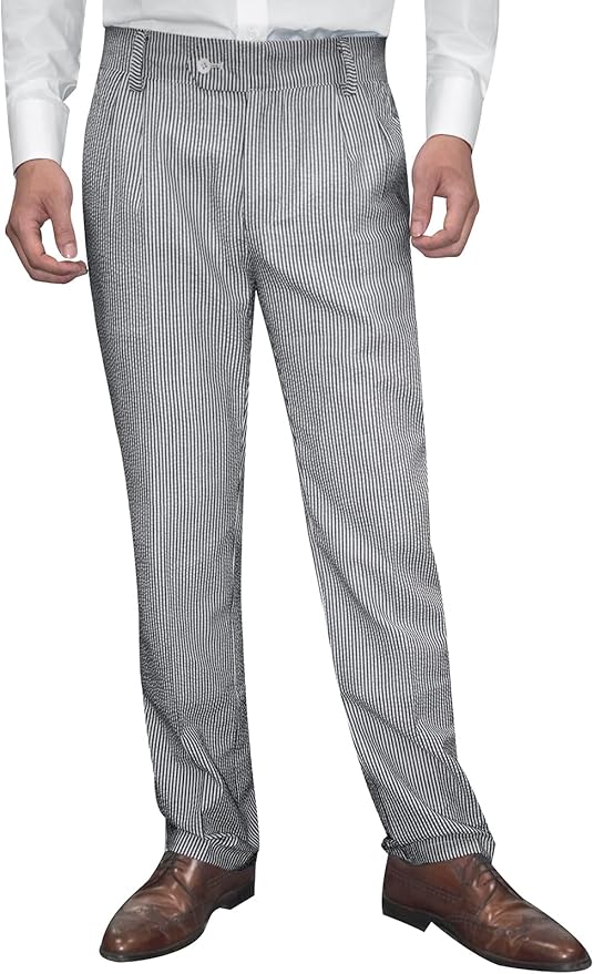 Men Seersucker Pinstripe Pants Mid Waist Ankle Length Pleated Front Lightweight
