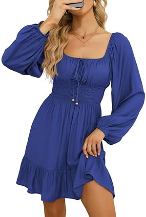 Dokotoo Womens Dresses Square Neck Long Puff Sleeve Elastic Waist A-Line Casual Mini Dress