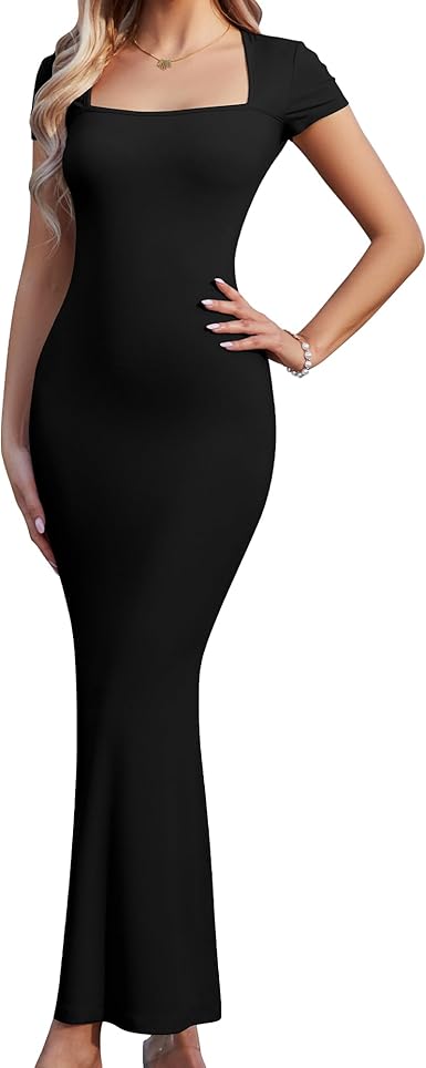 Women's Elegant Square Neck Long Dress Ribbed Bodycon Maxi Formal Dresses for Wedding Guest Evening Party
