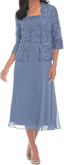 Tea Length Mother of The Bride Dresses for Women with Jacket Chiffon Wedding Guest Dress Lace Formal Dress