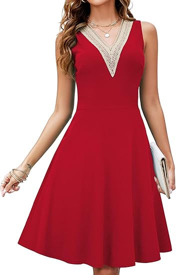 Womens Summer Lace Trim V-Neck Sleeveless Fit and Flare Tank Dresses with Pockets