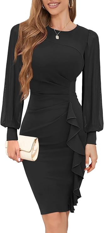 IHOT 2024 Women's Long Sheer Sleeve Ruched Sheath Bodycon Cocktail Party Work Dresses