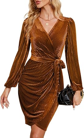 oten Women's Long Sleeve V Neck Velvet Bodycon Ruched Wedding Cocktail Party Club Faux Wrap Dress