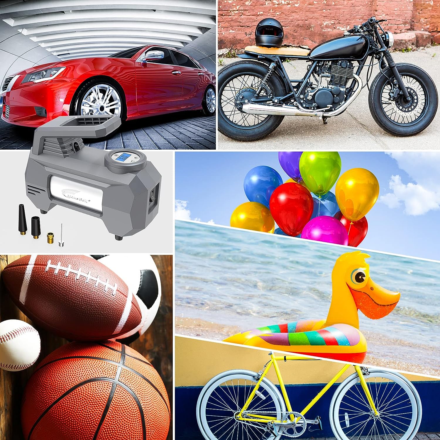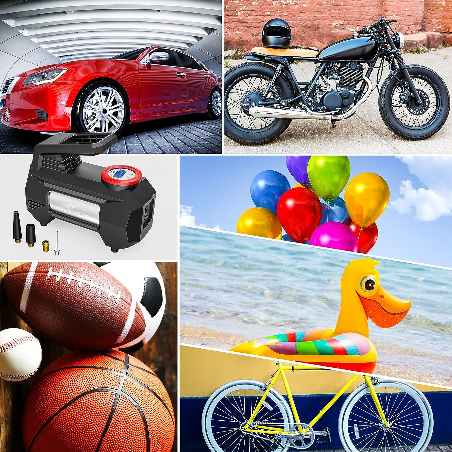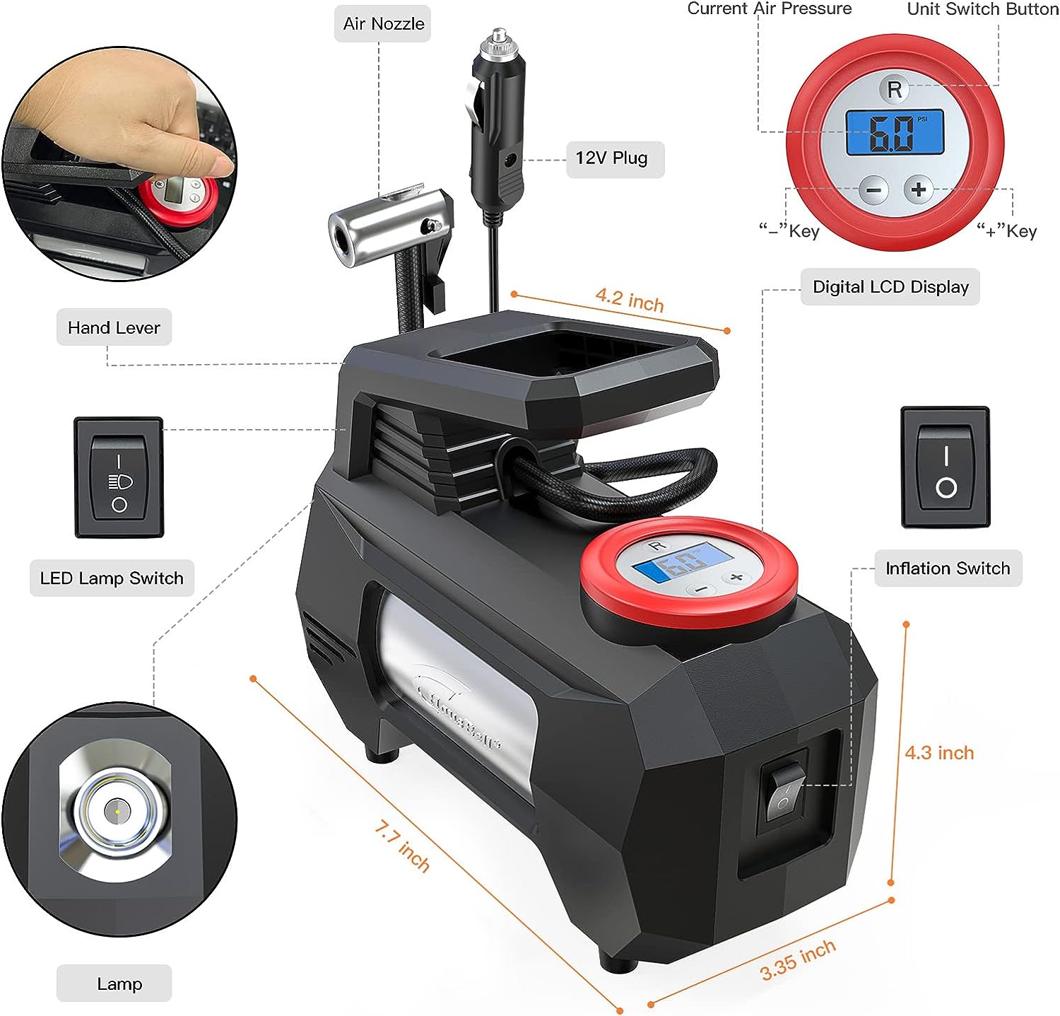 • 【CONVENIENT TO USE】: With the precise and bright digital tire pressure gauge display, you can make one-click adjustments between PSI, kPa, BAR, or KG/CM². Furthermore, the tire pump will shut off automatically when it reaches the desired tire pressure , so it is safe to use and won't overheat. In addition, this air pump can also inflate bicycles, motorcycles, swimming rings, basketballs, and footballs. ATTENTION: NOT for TRUCK TIRES