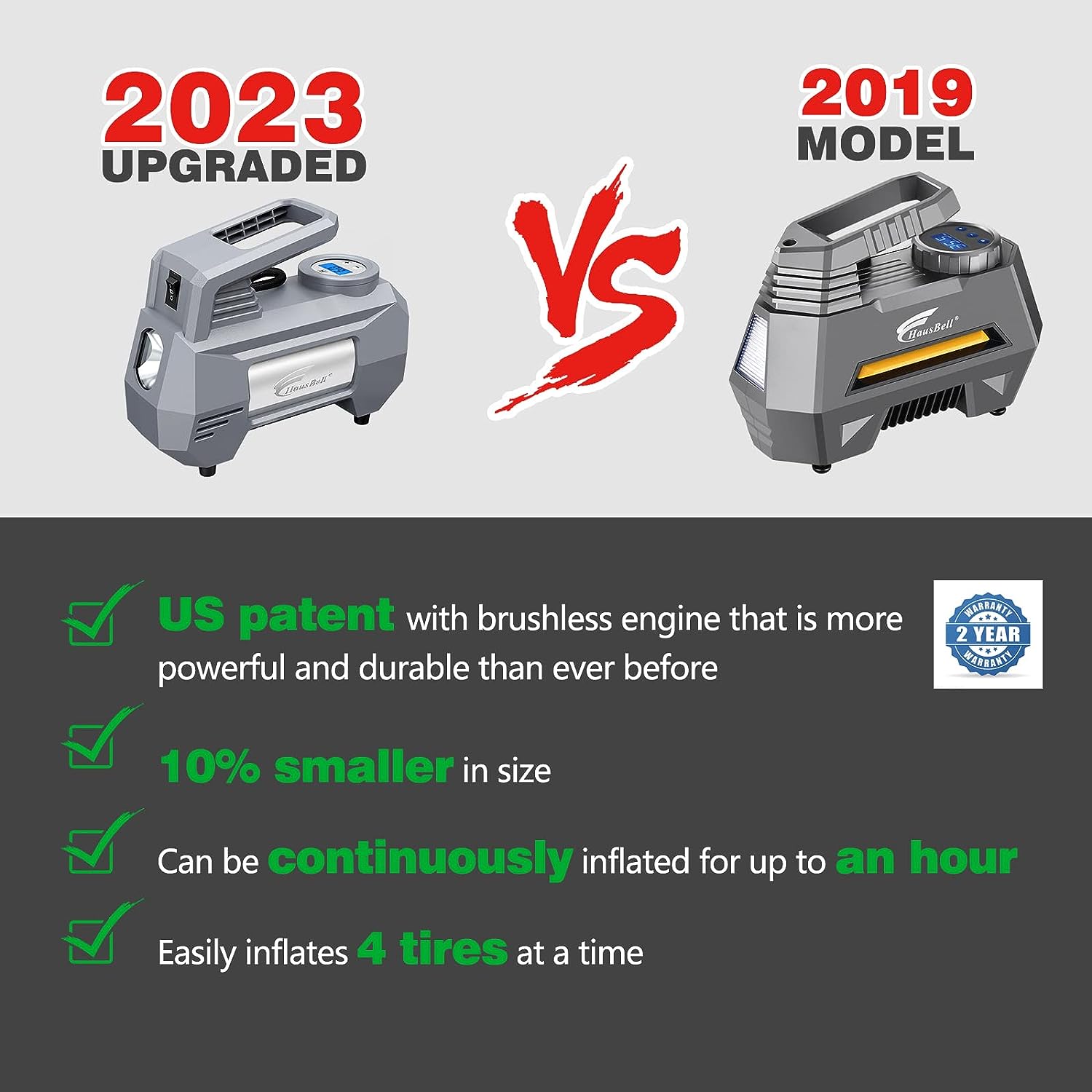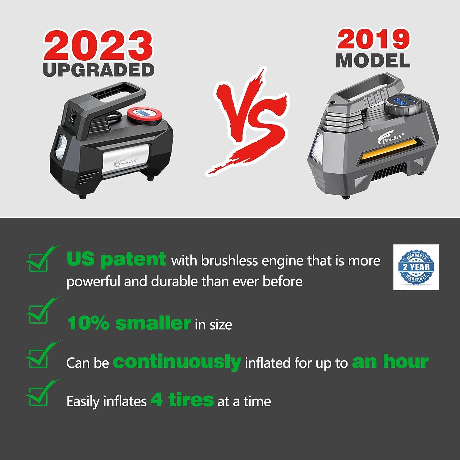 • 【POWERFUL DESIGN】: Compared with other brands of inflators that can only charge 1 tire at a time, the HAUSBELL air pump can continuously charge 4 tires.Faster than you ever thought, our 12V DC air compressor has a 120W high power engine that delivers a super-fast inflation rate of 35L/min.