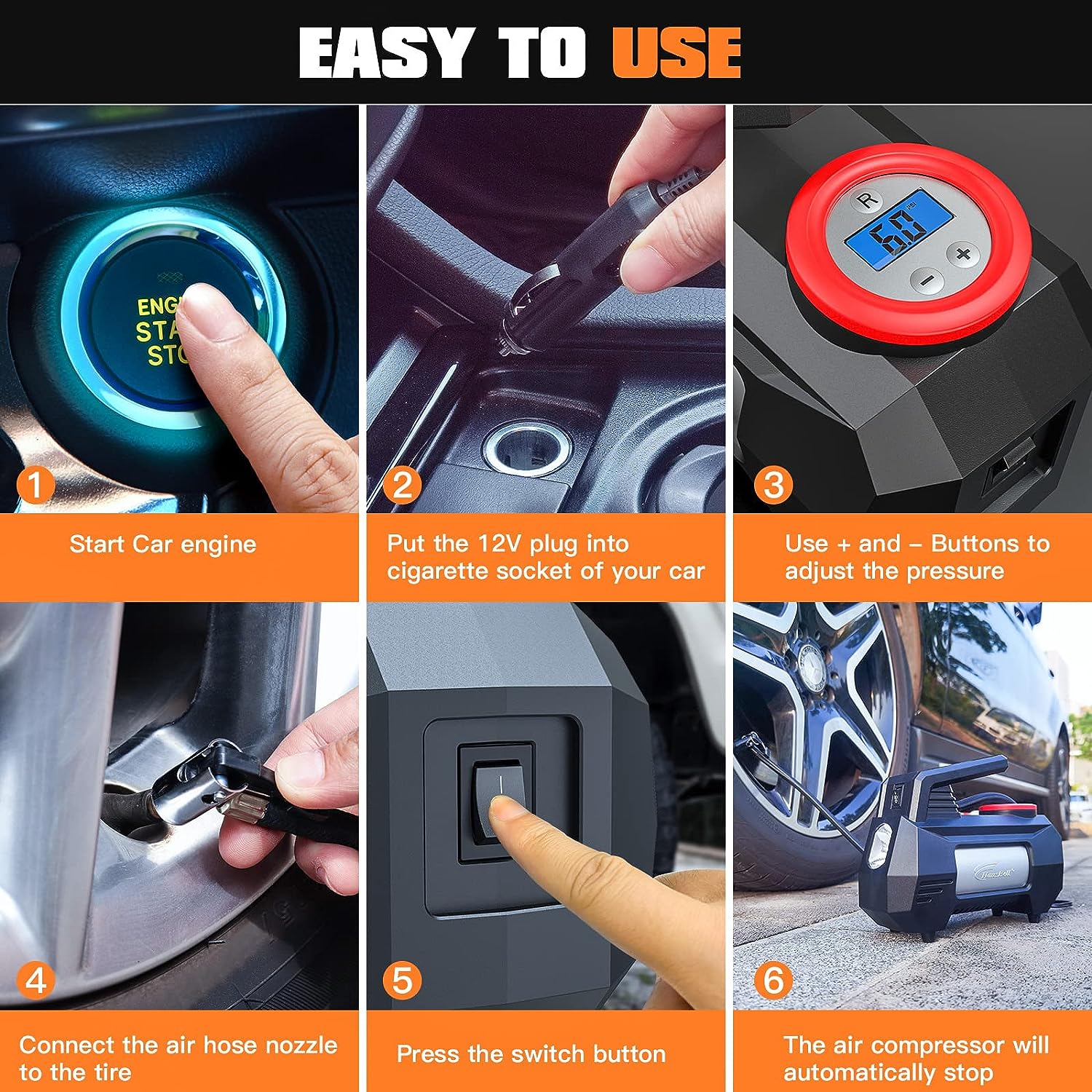 • 【New Upgrade of Core Components】:1.High speed motor with thicker copper wire. 2.Universal cylinder upgraded to high-strength metal pressurized cylinder. 3.99.9% high purity T3 copper radiator to improve heat dissipation. 4.The new intelligent AI control chip has been updated to improve the preset air pressure and automatic shutdown functions.