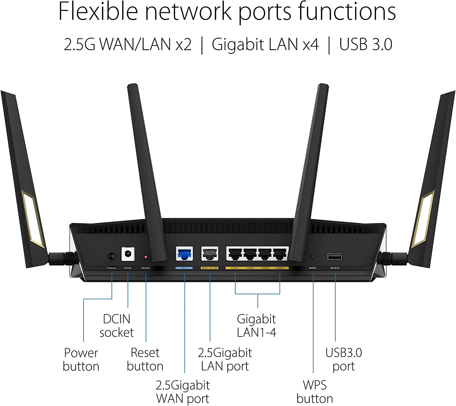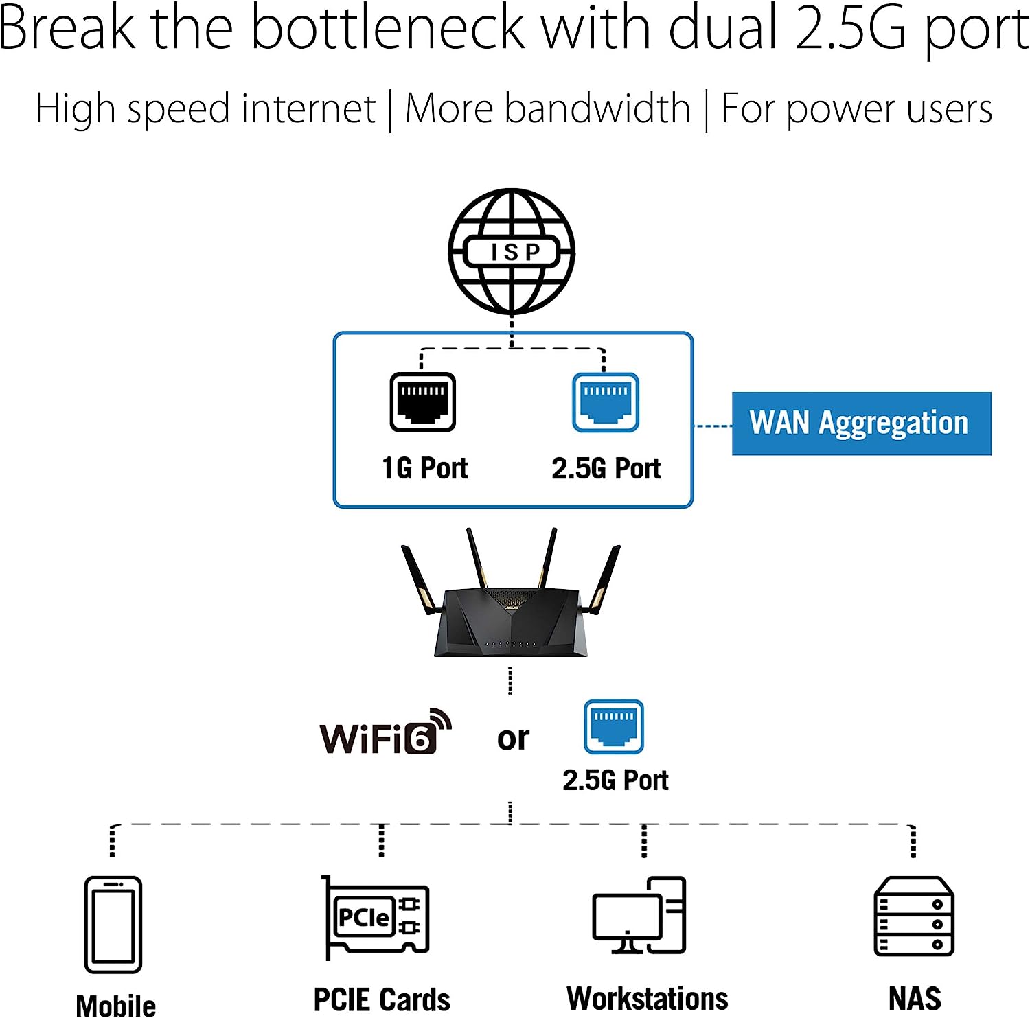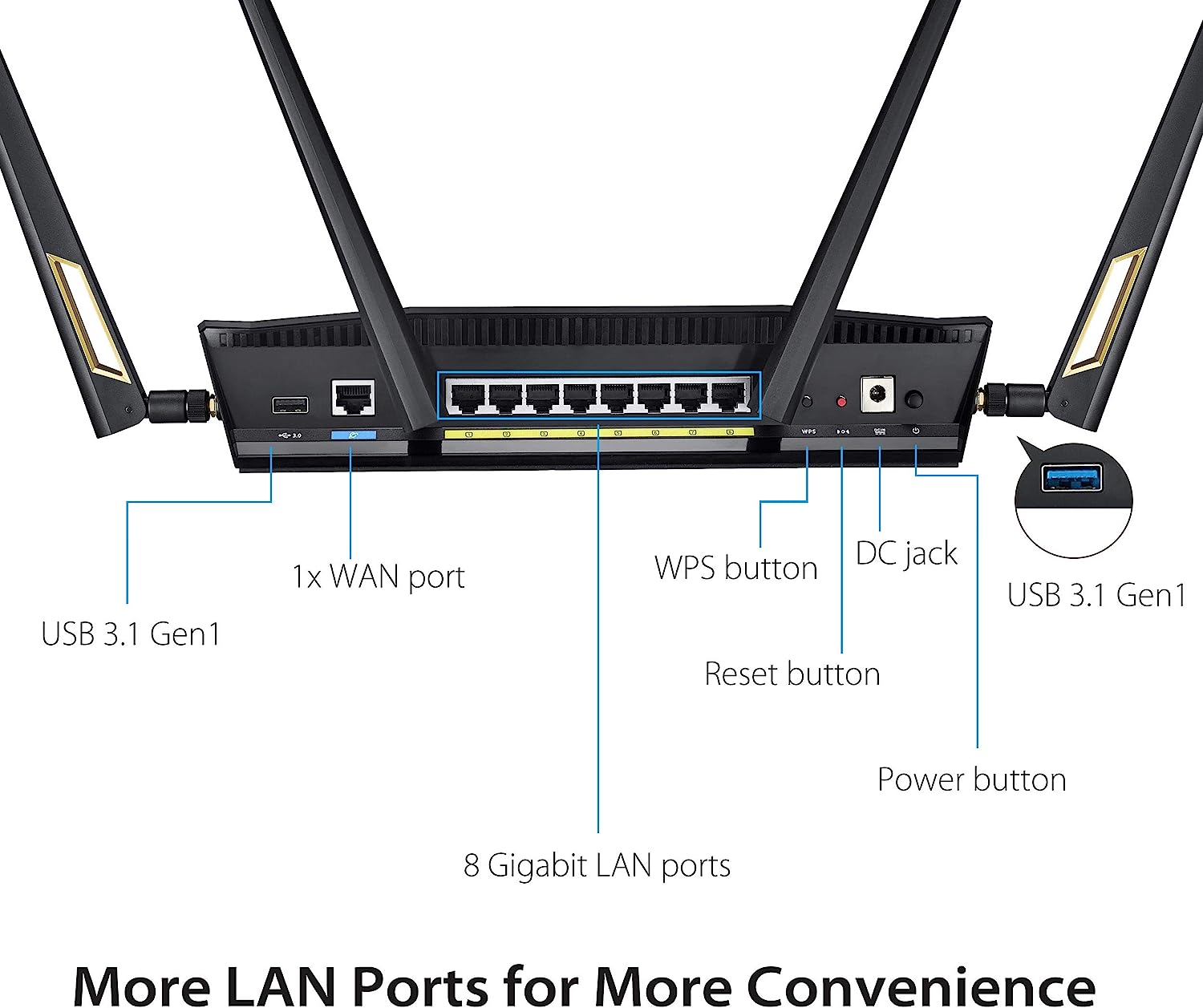 RT-AX88U Pro is a 4x4 dual-band WiFi router that provides 160MHz bandwidth and 1024-QAM for dramatically faster wireless connections. With a total networking speed of about 6000Mbps — 1148Mbps on the 2.4GHz band and 4804Mbps on the 5GHz band — RT-AX88U Pro is 2.3X faster than 802.11ac 4x4 dual-band routers.