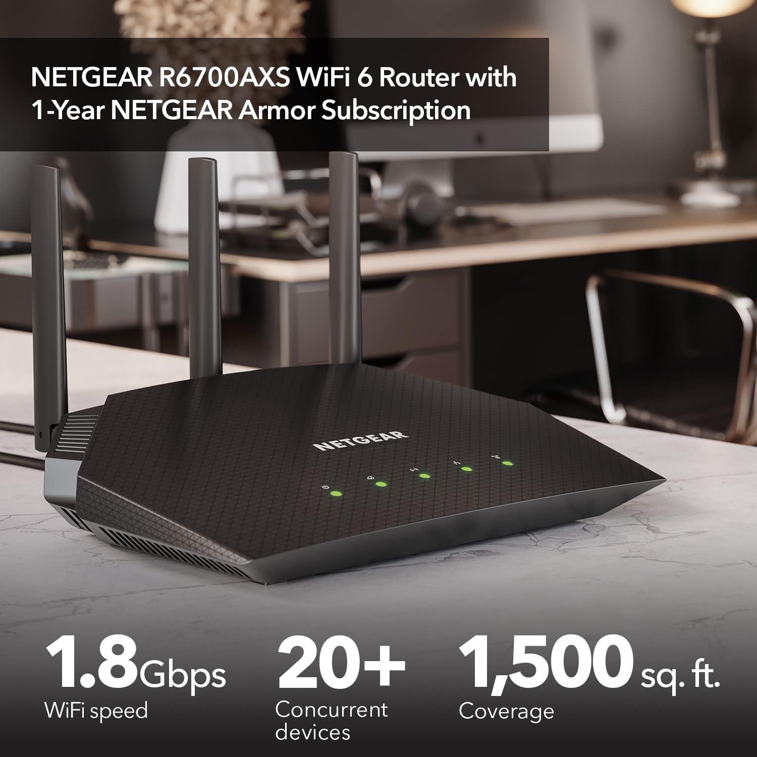 NETGEAR 4-Stream WiFi 6 Router (R6700AXS) – with 1-Year Armor Cybersecurity Subscription - AX1800 Wireless Speed (Up to 1.8 Gbps) | Coverage up to 1,500 sq. ft., 20+ devices, AX WiFi 6 w/ 1yr Security