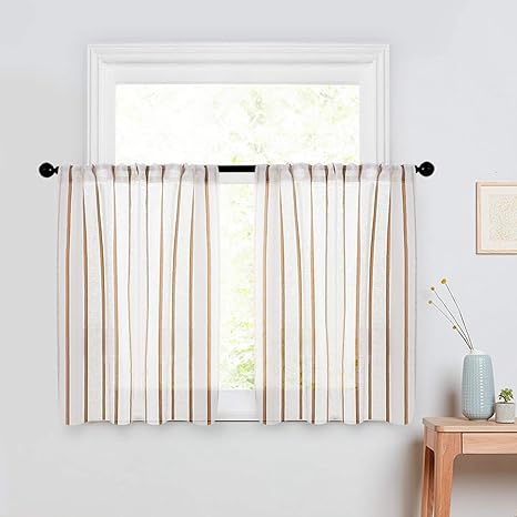 MRTREES Kitchen Curtains Striped Semi-Sheer Tier Curtains Farmhouse Pinstripes Linen Textured Short Cafe Curtain Panels for Bathroom Living Room RV Rustic (2 Panels, W30ՋL45, Taupe on White)