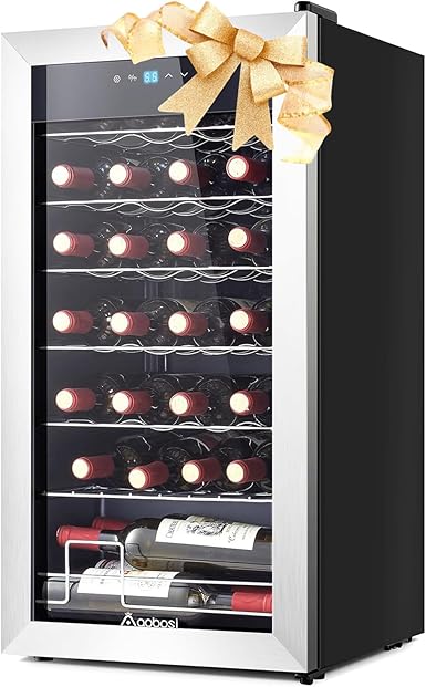 AAOBOSI Wine Fridge, 17 Inch Wine Cooler, Freestanding Double-Paned Tempered Glass 28 Bottles Wine Refrigerator Small, Low Noise Compressor, Blue LED Display, Adjustable Shelves, Temperature Memory