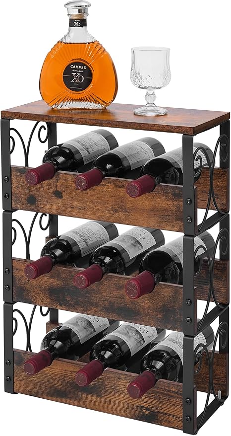 3-Tier Wine Racks Countertop, Stackable Wine Rack Freestanding Floor Wine Holder Countertop, 9 Bottles Wine Bottle Holder, Liquor Shelf, Wine Storage Racks for Kitchen, Pantry, Cabinet, Bar, Rustic Brown
