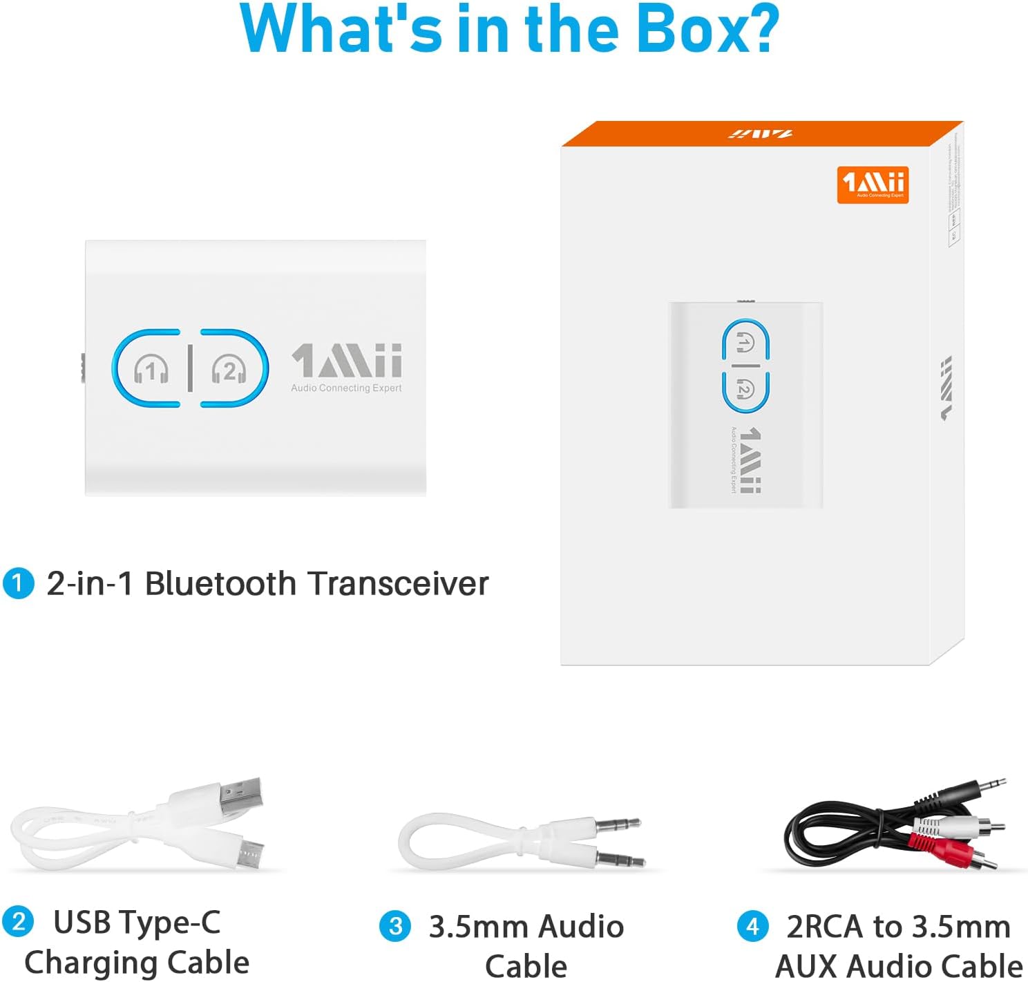 • 【2-IN-1 Transmitter & Receiver】1Mii Bluetooth audio transmitter supports transmitter and receiver mode. In Transmitter mode, it is very easy to turn a non-Bluetooth TV, PC, gym/flight equipment into Bluetooth transmitter. In receiver mode, Bluetooth 5.3 chip ensures high fidelity Bluetooth audio signal for music streaming to those speakers or car/home stereo systems that doesn’t have the Bluetooth capability.