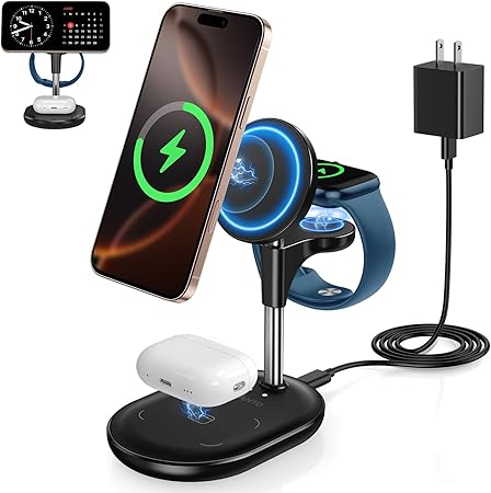 3 in 1 Wireless Charging Station for Apple MagSafe Charger, 15W Fast Qi-Certified Magnetic Mag-Safe Charger Stand for iPhone 16 15 14 13 12 Apple Watch AirPods, Adjustable Angle, Gifts for Men