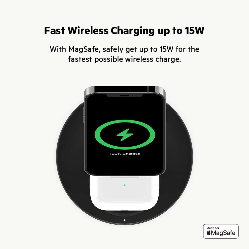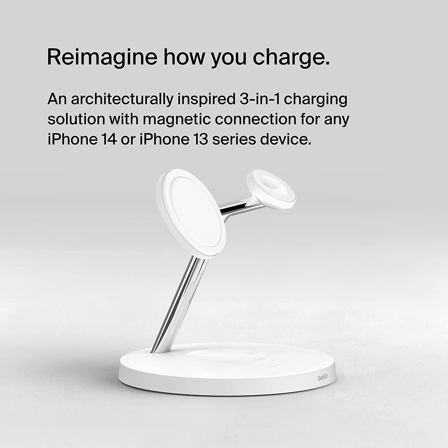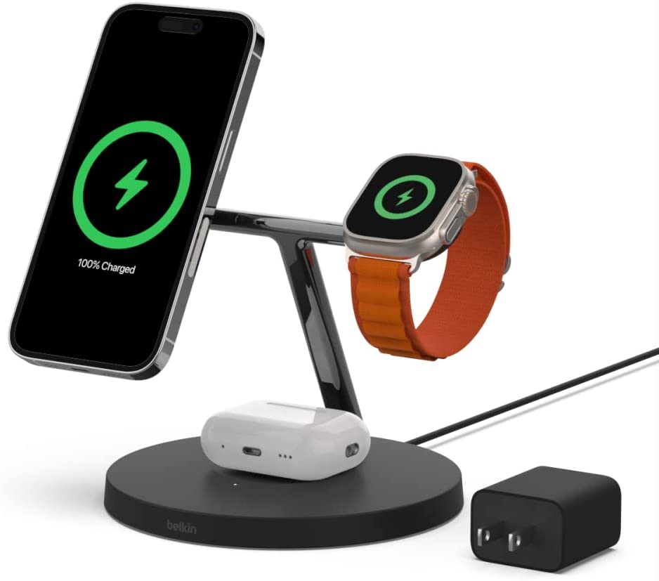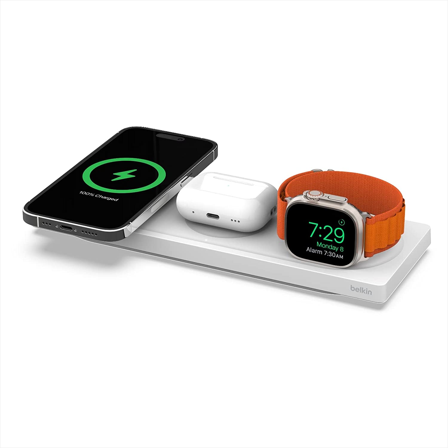 The Belkin MagSafe 3-in-1 Wireless Charging Stand supports multiple device orientations, just place your iPhone on the charging stand for a secure, aligned connection in portrait or landscape mode. The wireless charging puck and pad are optimized for your Apple Watch, AirPods and AirPods Pro. With this Belkin Magnetic Wireless Charger Stand, you'll always have a convenient place to charge your iPhone.