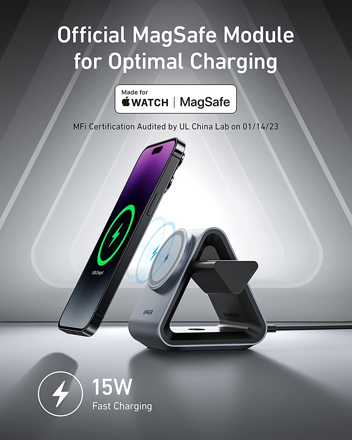 MagSafe Charger, Anker 737 MagGo Charger (3-in-1 Station) with MFi-Certified 15W Max Fast Charging, for iPhone 14/13 / 12 Series, Apple Watch S8 / Ultra, AirPods 3 / Pro (30W USB-C Charger Included)