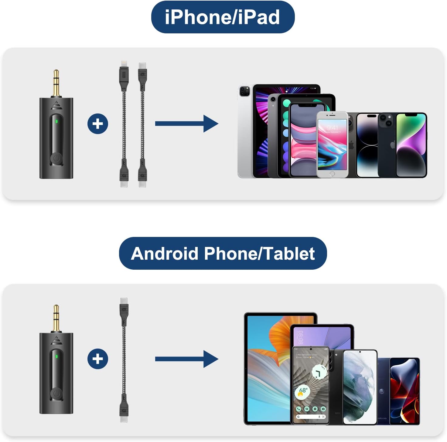 • Plug and Play & Automatic Connection: No Driver, Bluetooth or Application needed. Select the cable adapter that suits your device, then connect the receiver to your device, and then turn on the power button of the two parts, these two parts will pair automatically.