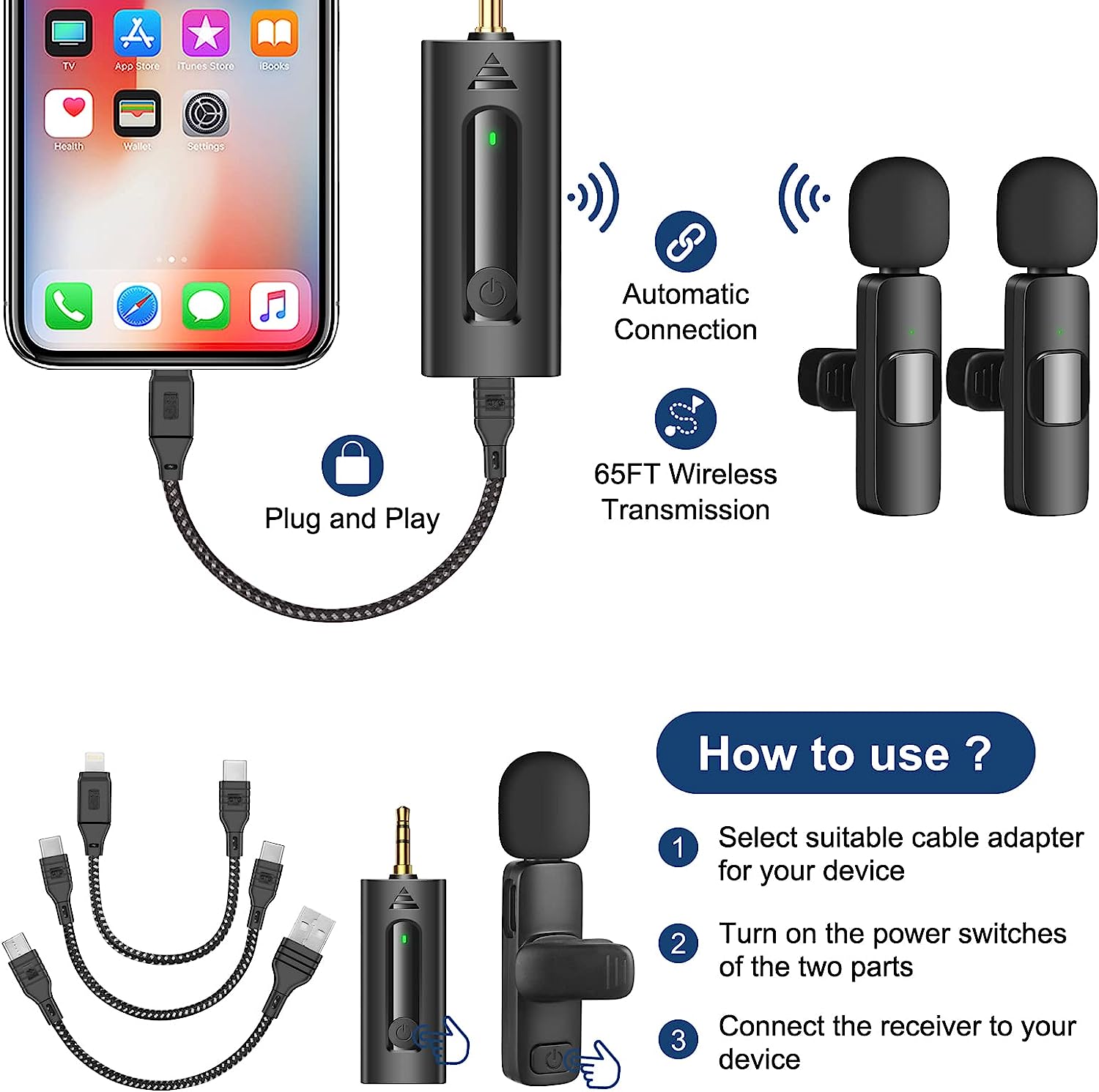 • Dual Wireless Microphones: This wireless lavalier microphone kit includes 1 receiver, 2 microphone transmitters and 3 cable adapters, which makes it possible to record sound or video from both 2 parties at the same time. Of course, you can also use either microphone alone. Professional designed for Vloggers, YouTubers, Bloggers, Interviewers and other video recording lovers.